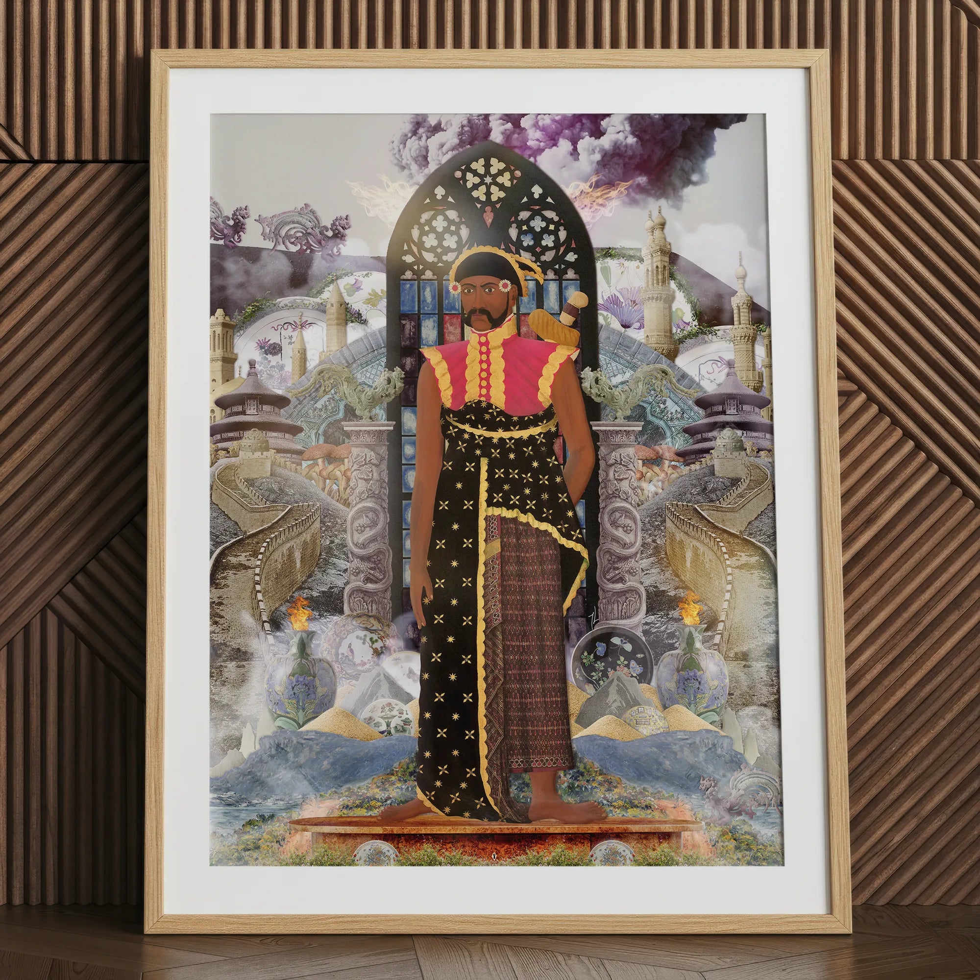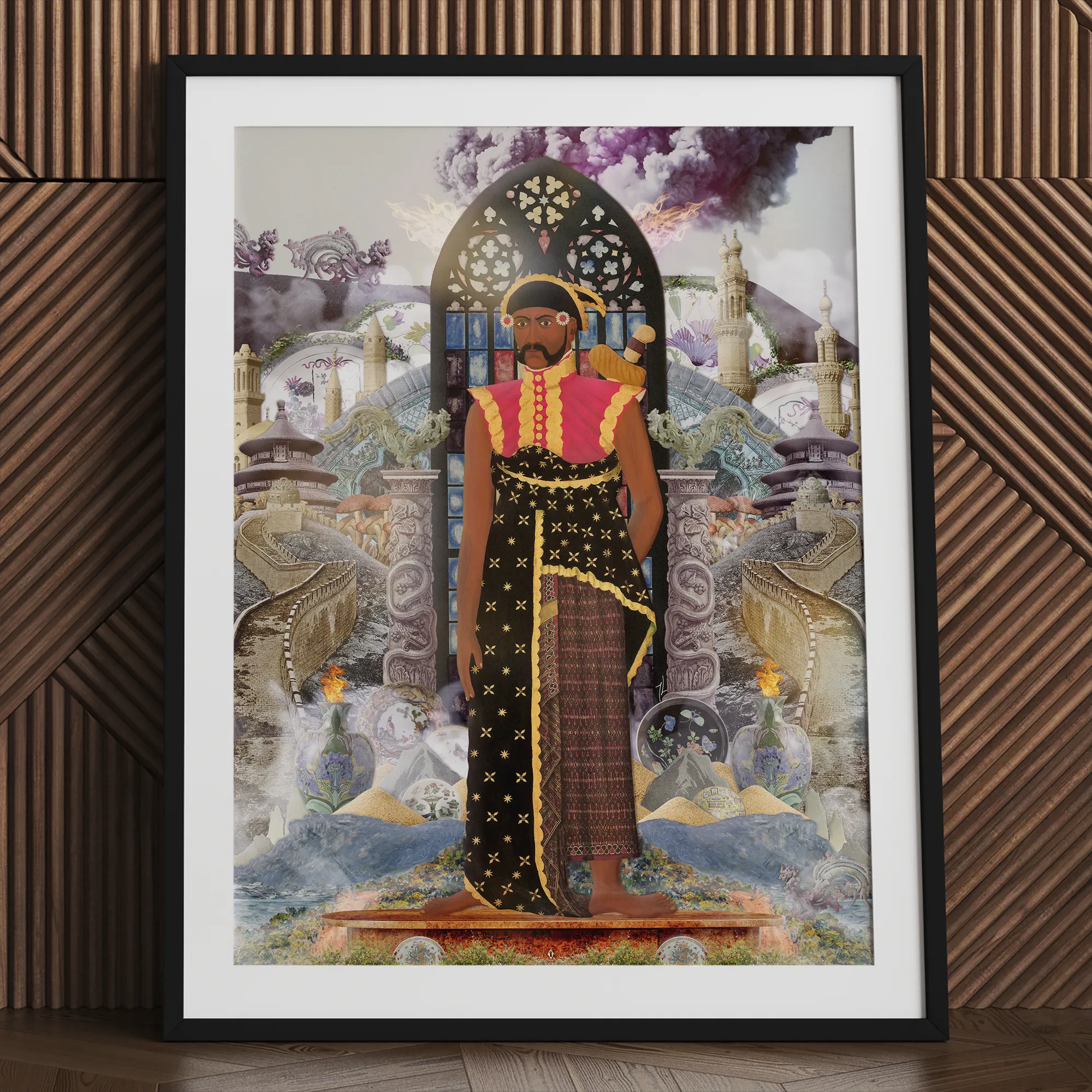 Questo collage neo-surrealista intreccia un arazzo di paradossi. Motivi floreali delicati si scontrano con forme industriali austere, rispecchiando il tira e molla tra colonizzatore e colonizzato. Sfere di vetro cullano mondi in miniatura, suggerendo la fragilità dell'identità culturale in un'era globalizzata. Lascia che questa riproduzione di qualità museale trasformi il tuo spazio in un portale dove le grandi narrazioni della storia si svelano, rivelando i complessi fili della connessione umana attraverso il tempo e lo spazio.
