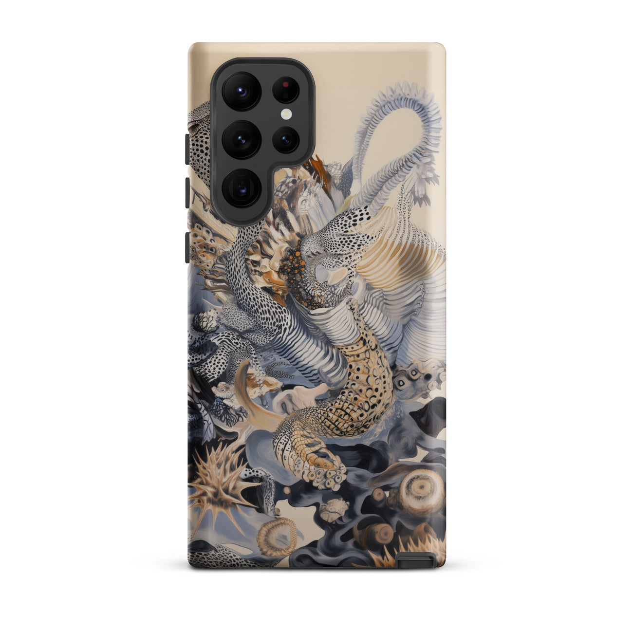 Questa custodia Samsung è un manoscritto subacqueo, che registra un mondo in cui predatori e fiori condividono un solo battito. Tenerlo è come portare l'abisso: radiante, inconoscibile, decorato con forme di vita inventate nella febbre degli oceani che ancora sognano di diventare.