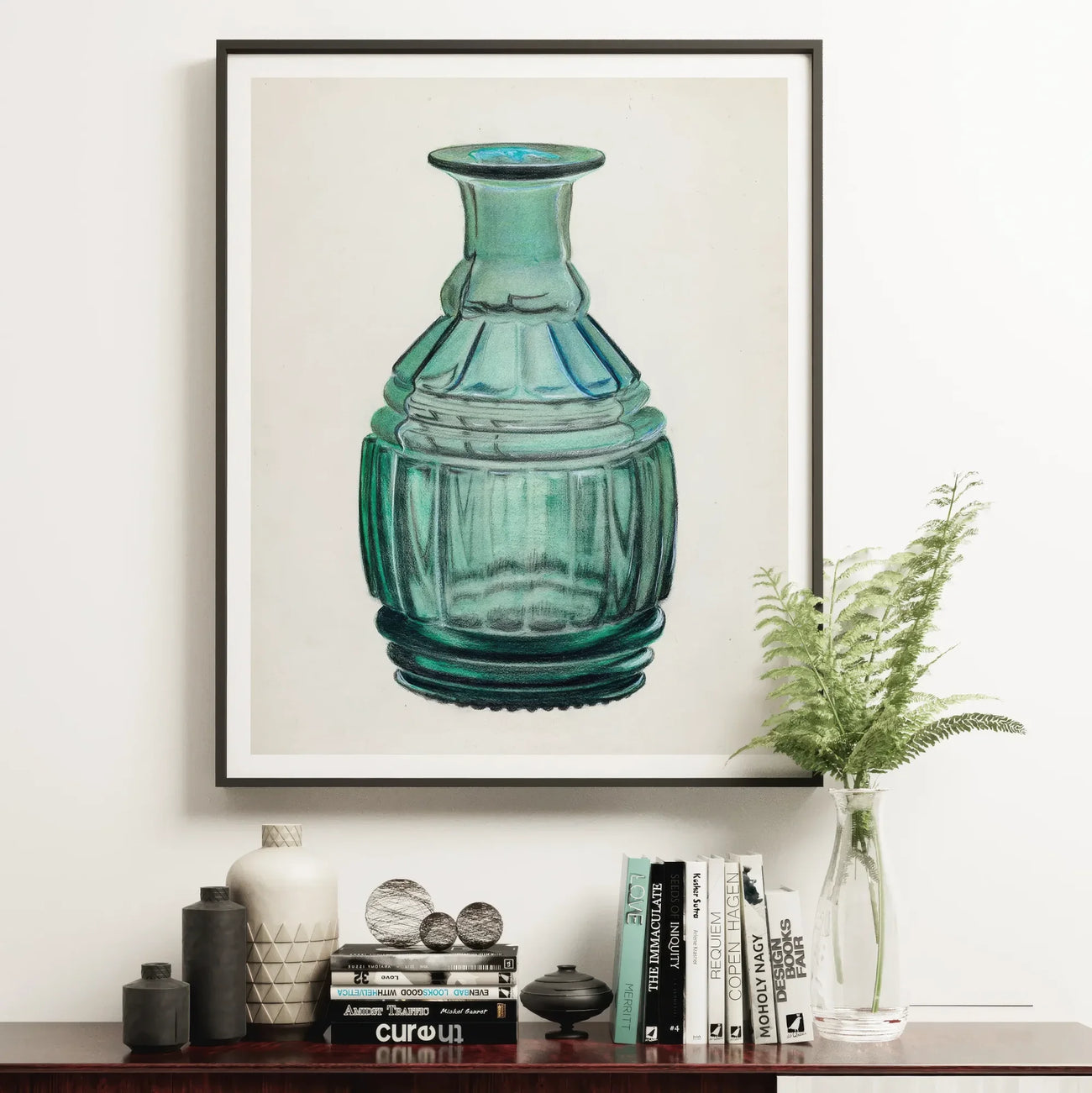 Disseta la tua sete di eleganza vintage con questa squisita stampa artistica di caraffa in vetro color teal. L'illustrazione di Van Silvay degli anni '30 cattura l'essenza dell'opulenza Art Deco in ogni curva traslucida.