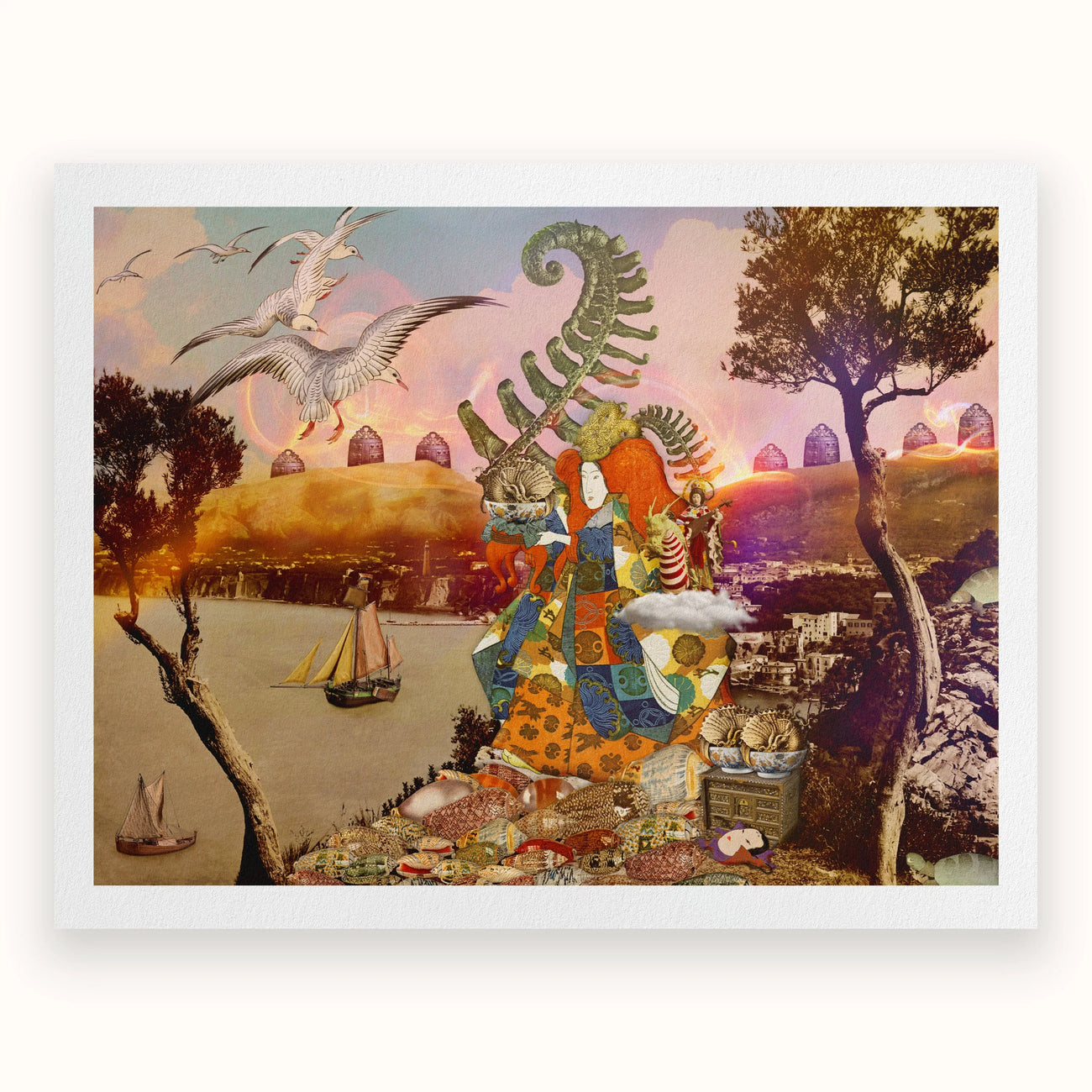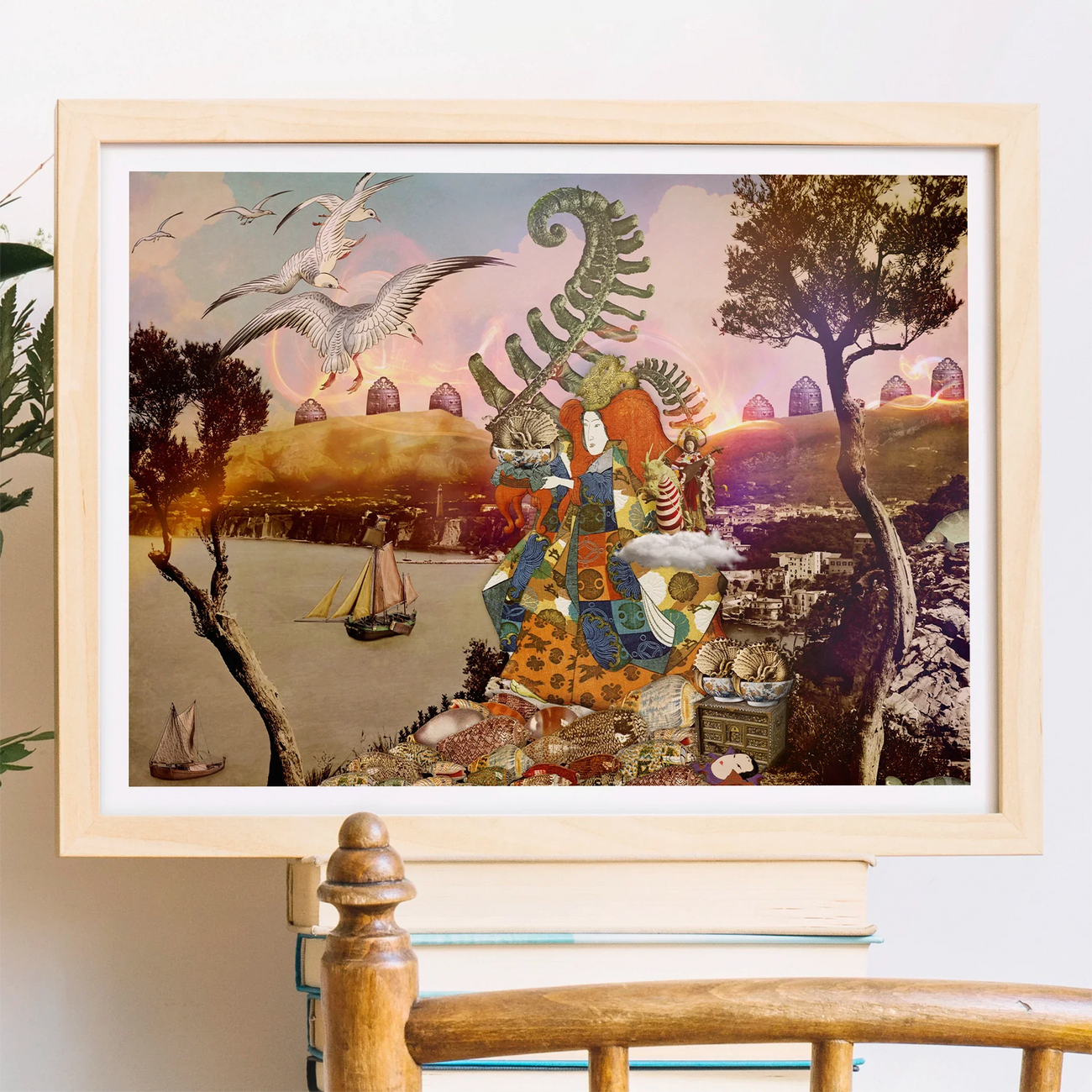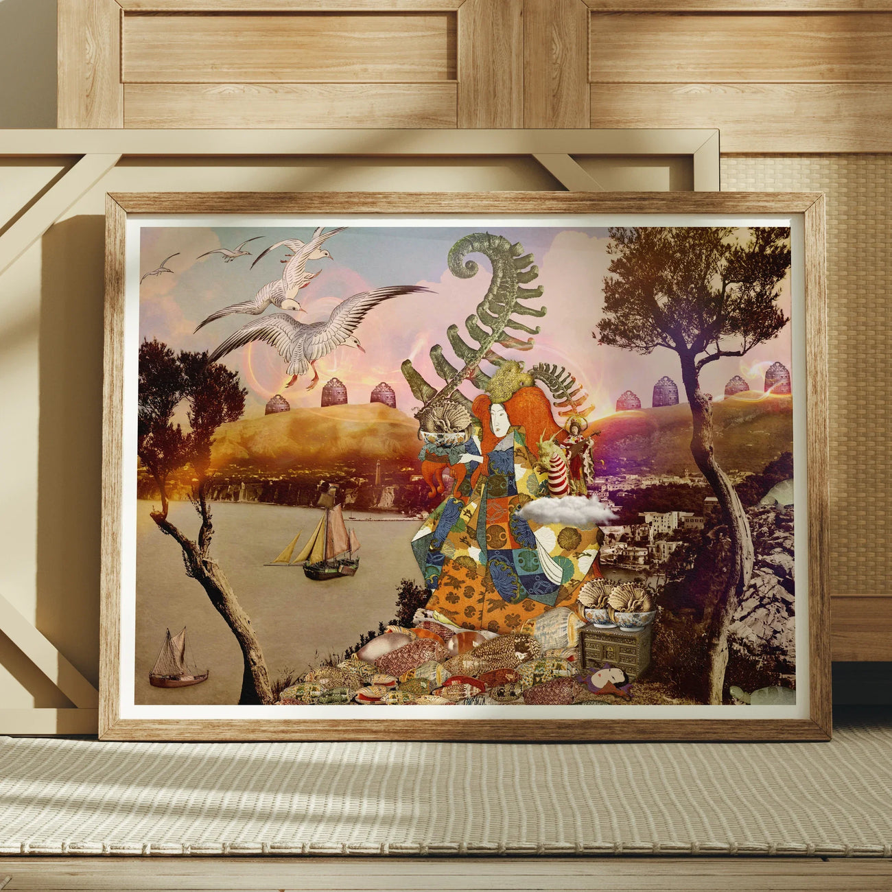 Questa stampa surrealista eclettica ti invita a esplorare il suo simbolismo stratificato. Una figura centrale, adornata con un patchwork di texture, sta a guardia di un mondo dove natura e mito si scontrano. Gabbiani onirici danzano con felci fantastiche, mentre strutture in miniatura punteggiano colline lontane, suggerendo storie nascoste all'interno di questo mondo onirico mistico.