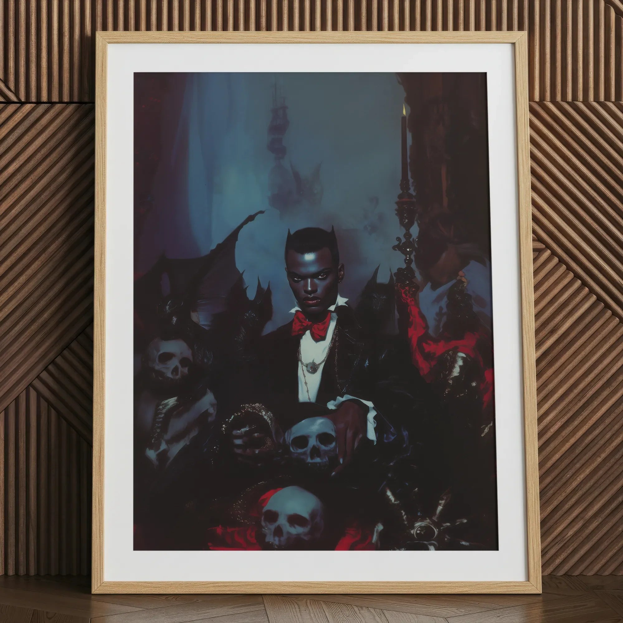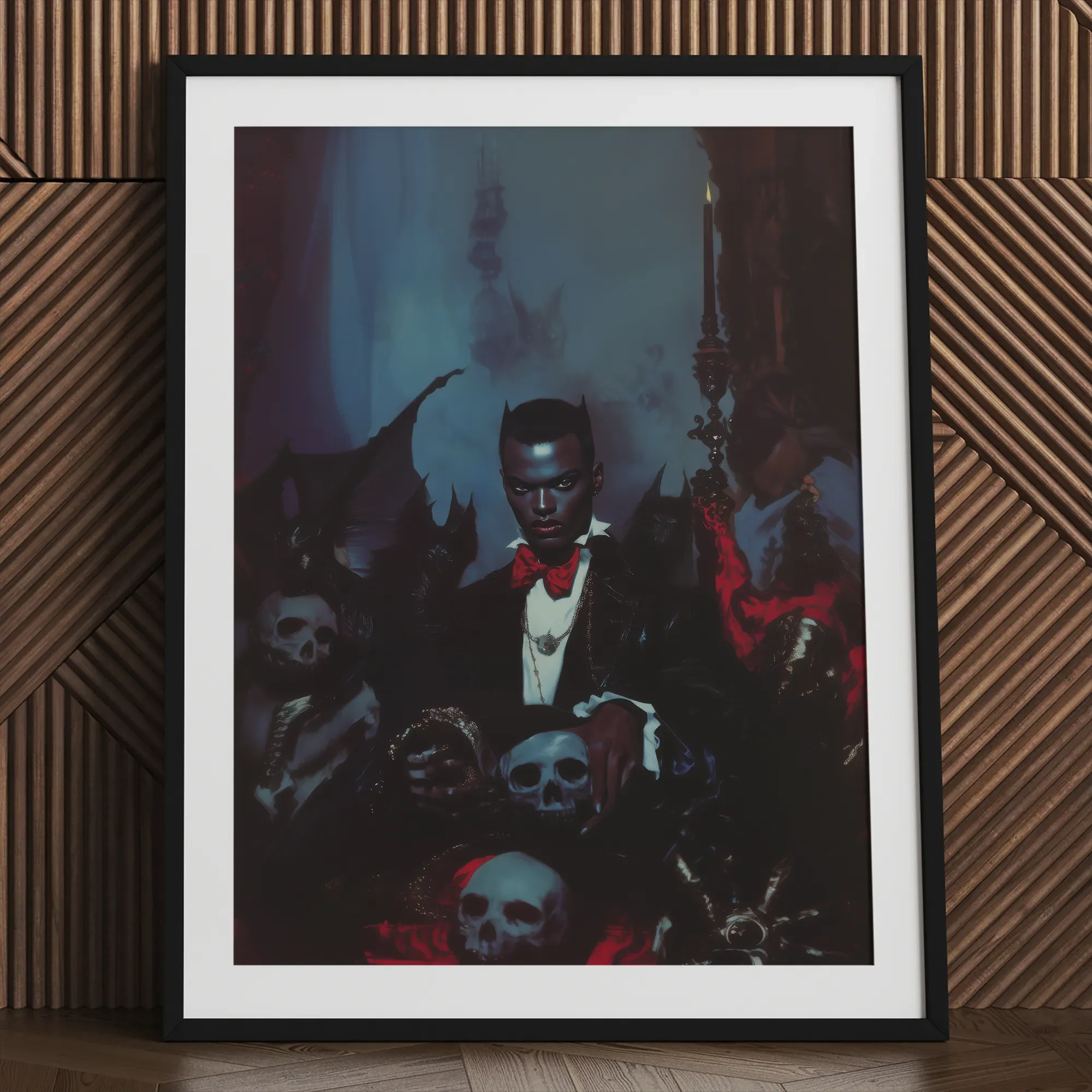 Questo ritratto di un vampiro nero e gay non è solo arte; racconta la storia di un potere reclamato e un'identità che sfida l'ordinario. Perfetto per coloro che prosperano nel fantasy oscuro e cercano eleganza gotica con temi apertamente queer. Che tu sia un amante della mitologia di Dracula o desideri un arredamento che parli del potere seducente della notte, Thorne comanderà il tuo spazio con un'aria di nobiltà gotica.