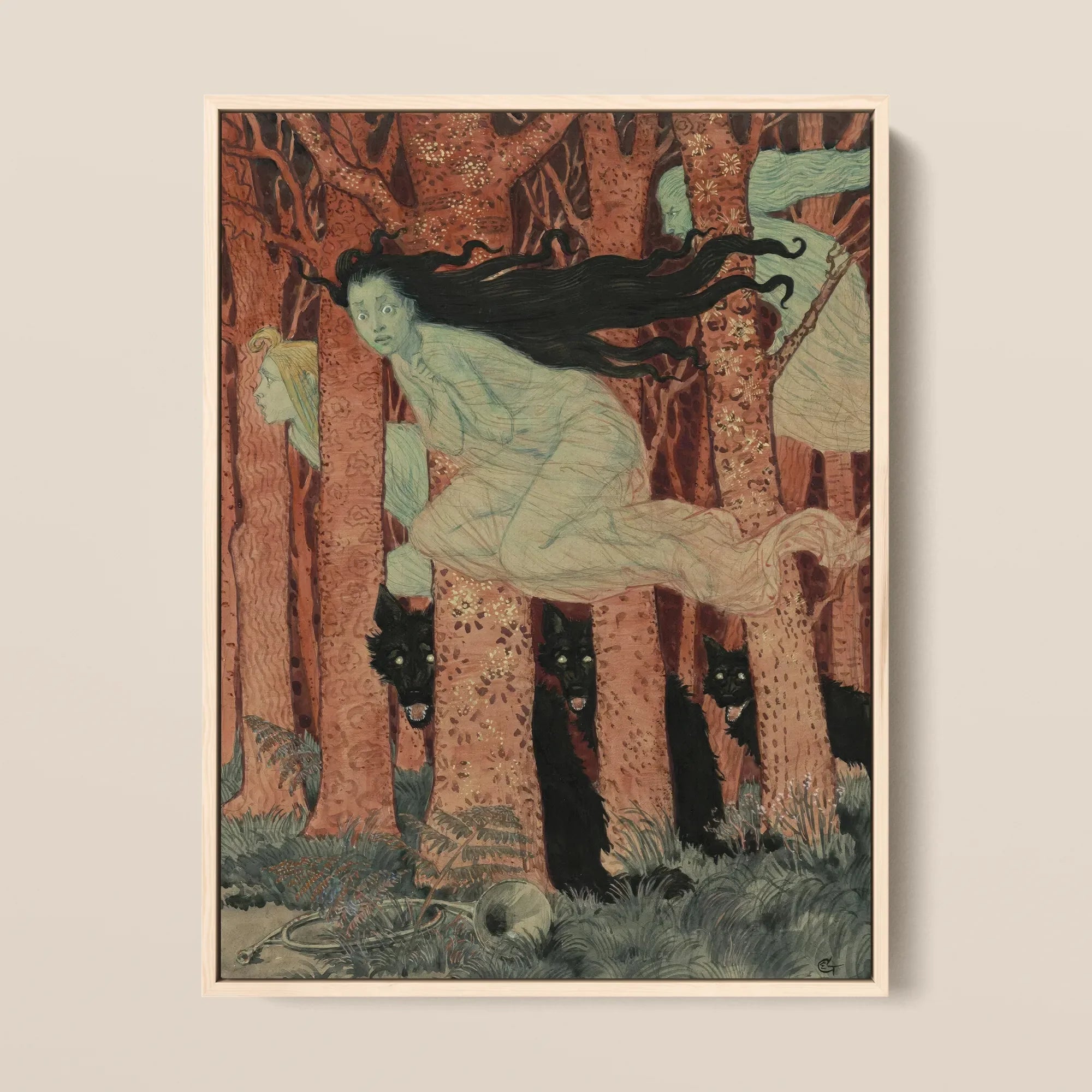 La sensibilità Art Nouveau del pittore incontra l'allegoria gotica: purezza inseguita dalla predazione, sogno annodato al pericolo. Ogni pennellata brilla con precisione cromolitografica—corteccia ocra, luce turchese, carne spettrale.