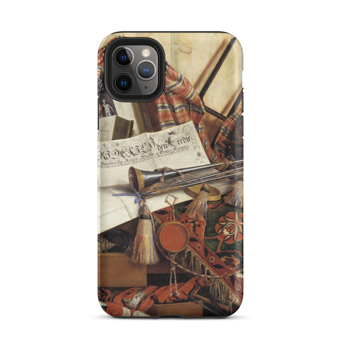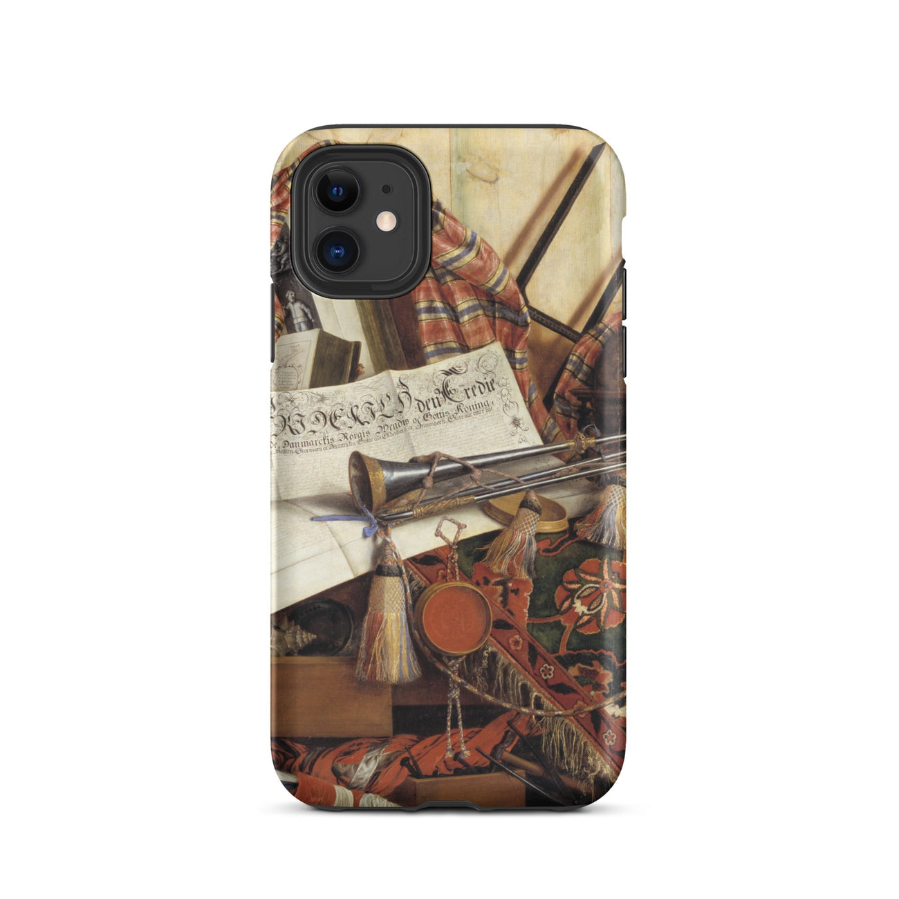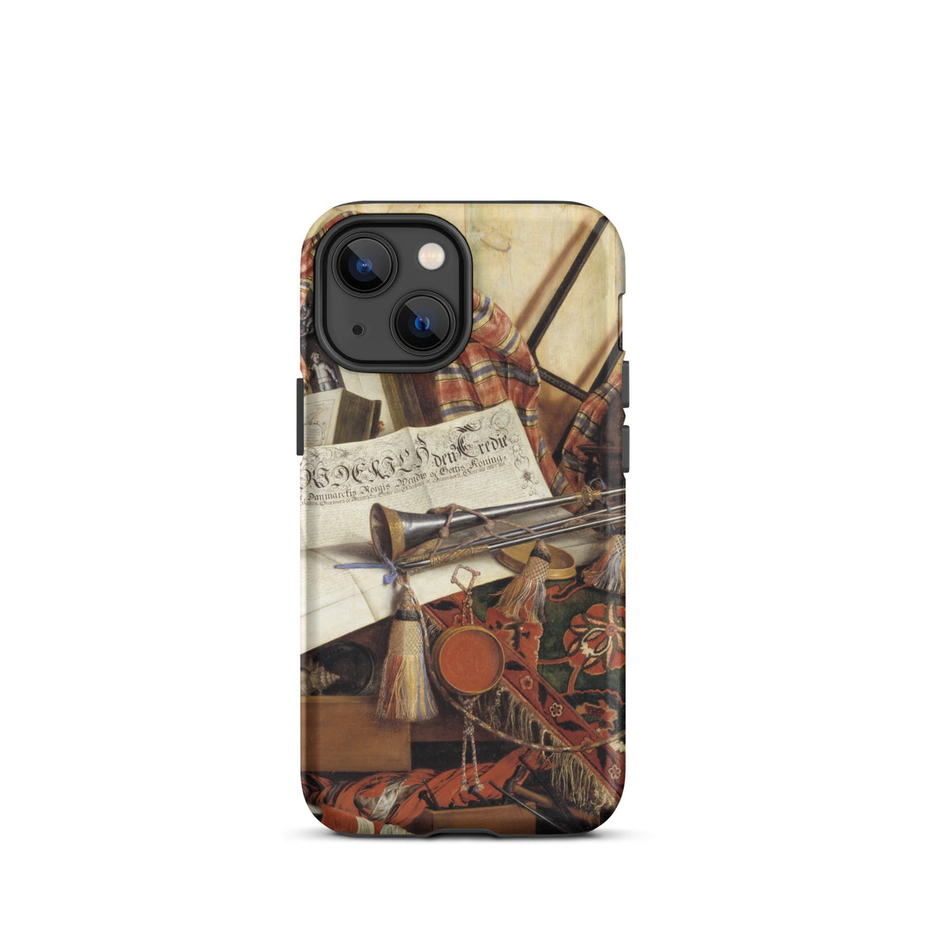 Una tromba giace immobile, ma il tuo occhio la sente. Una pergamena respira un decreto reale, anche se è piatta come aria laccata. Questo non è solo una custodia per iPhone trompe-l'œil—è una mascherata cortigiana di materia e illusione, composta da Cornelis Norbertus Gijsbrechts, il burlone fiammingo che ha trasformato la percezione stessa in un inganno messo in scena. Qui, nel suo Trompe-l'œil con Tromba, il mondo è appiattito in teatro: le nappe pendono come attori a metà soliloquio, un globo celeste attende fuori scena il suo segnale, e le pieghe di raso sognano il movimento.