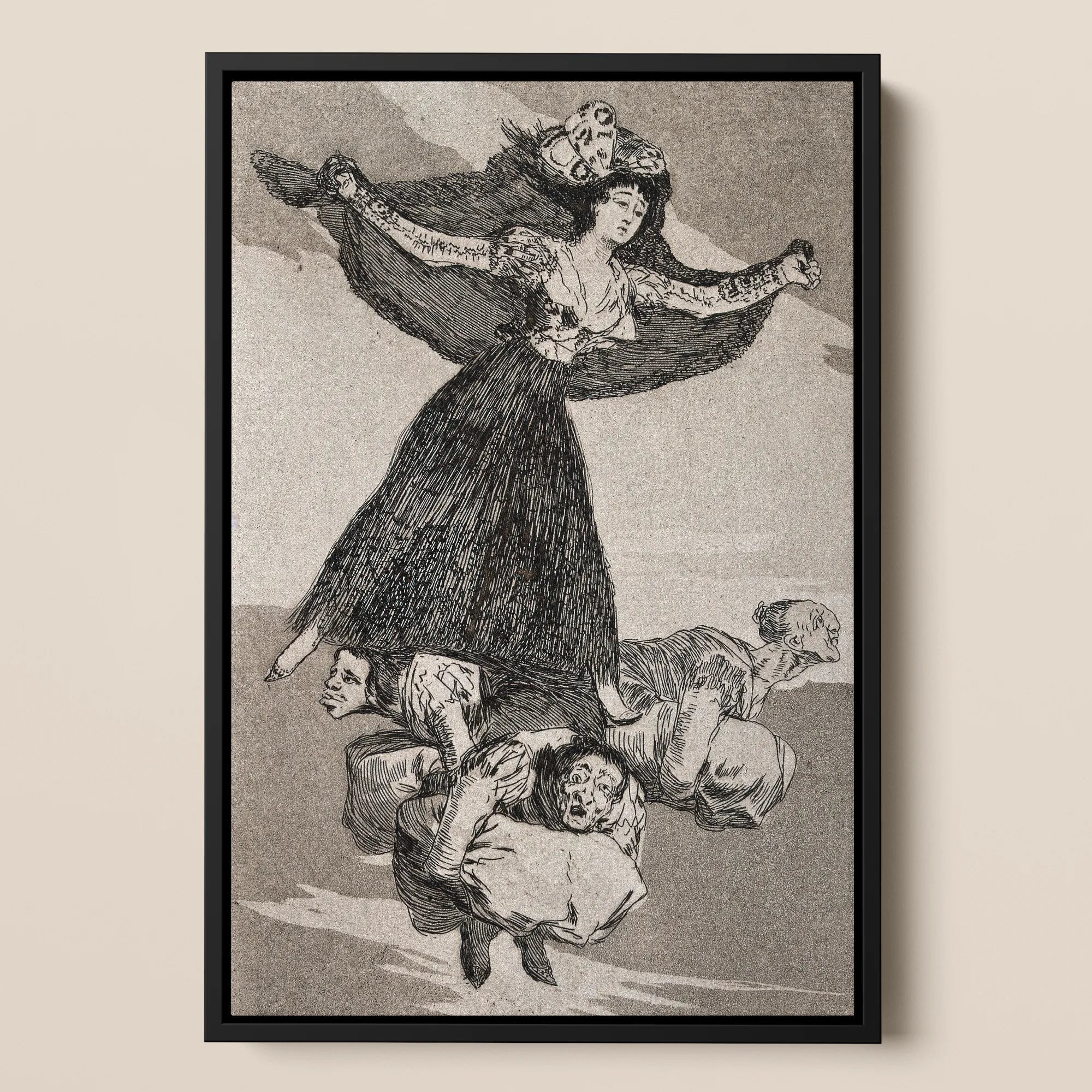 Questa stampa d'arte raffinata distilla la rivolta di Goya contro la vanità e la credulità, la sua incisione acida che espone il teatro sociale che incoronava la corruzione con grazia. La donna ascende attraverso l'ironia, la sua compostezza è sia aureola che accusa, fluttuando sopra un mondo troppo cieco per riconoscere la sua stessa adorazione assurda.