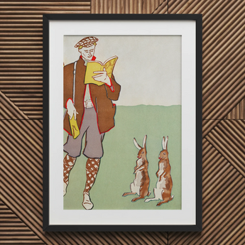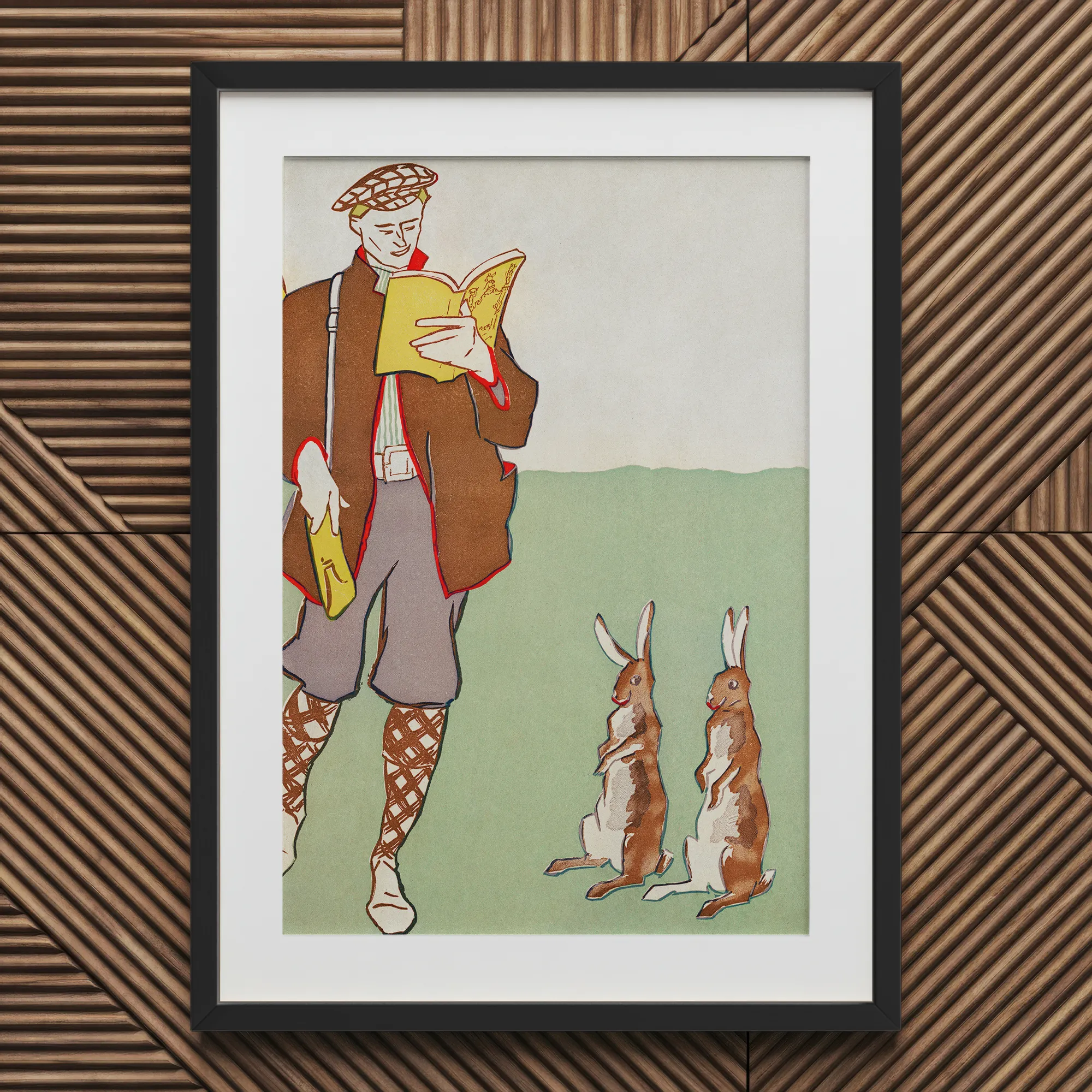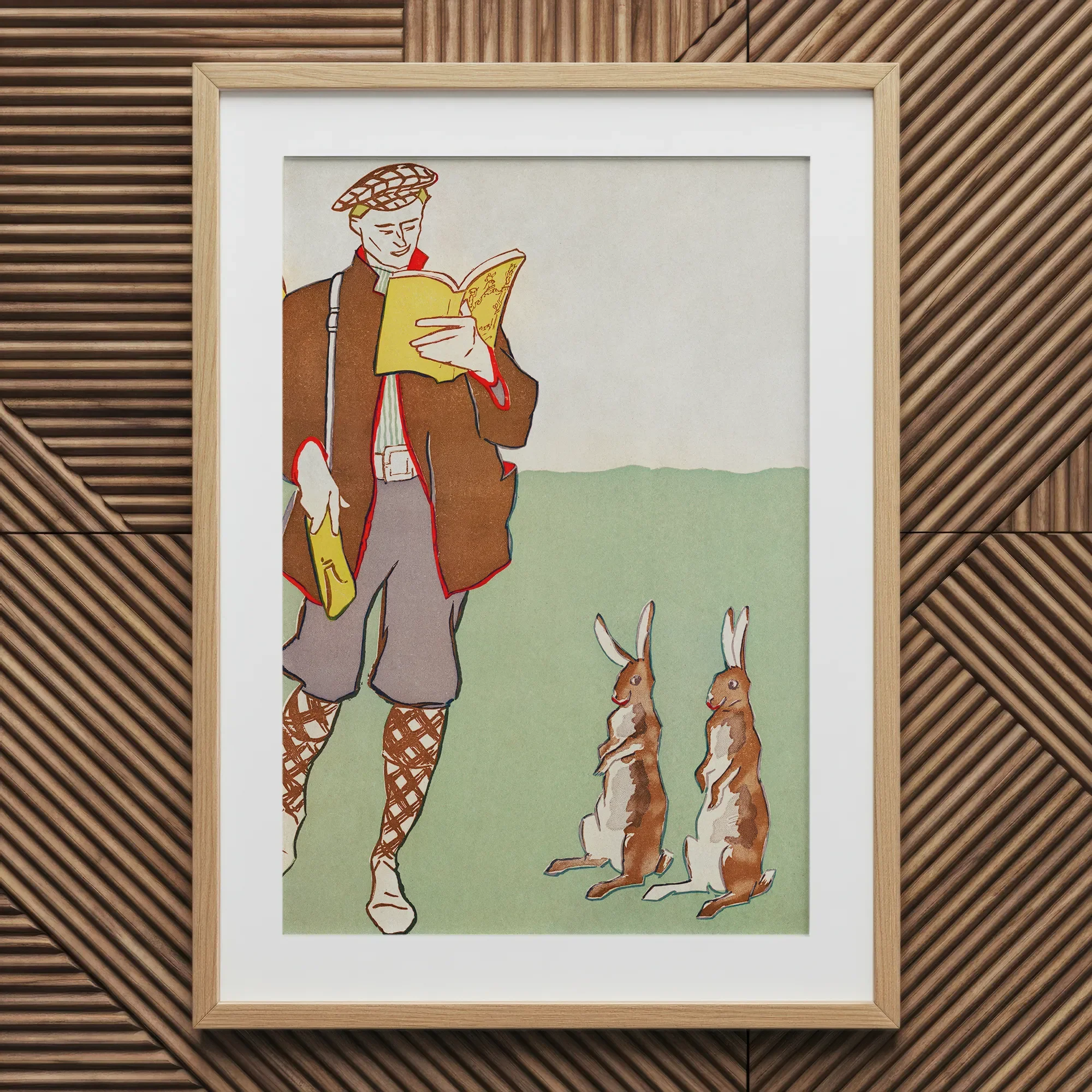Uomo che legge un libro con lepri - Print d'arte di Edward Penfield
