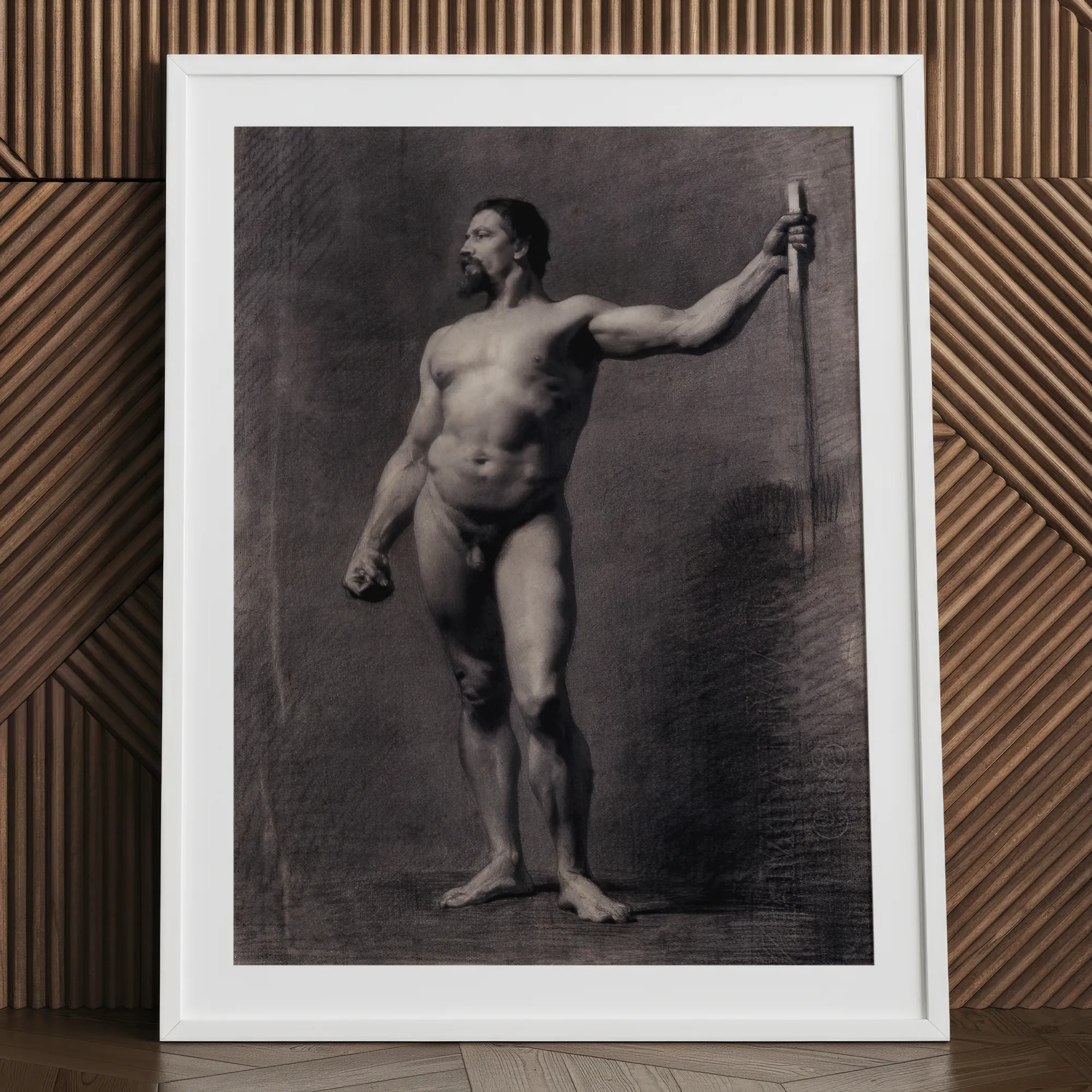 Ombre di carbone scolpiscono una figura maschile imponente, il suo torso appesantito dal volume e la sua posizione fortificata dall'asta verticale nella sua presa. Mariano Fortuny Marsal cattura l'anatomia con precisione incrollabile, l'addome muscoloso, l'avambraccio venato e la coscia tesa resi in chiaroscuro che evoca uno studio accademico.