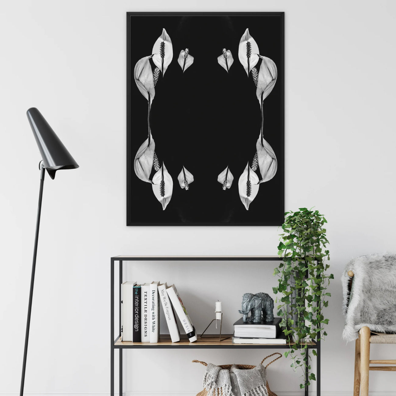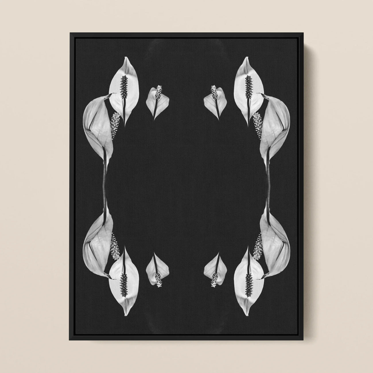 Ti ritroverai perso nel complesso merletto degli stami e nelle curve sensuali dei petali, ogni elemento precisamente specchiato per creare un caleidoscopio ipnotizzante. Questa tela incorniciata trascende il semplice studio floreale, diventando un potente pezzo di dichiarazione che si colloca tra il minimalismo e la complessità naturale.