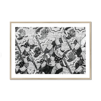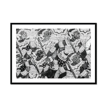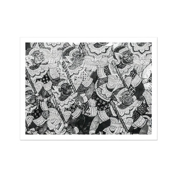 Zie een monochromatisch meesterwerk dat de essentie van de Thaise tempelkunst in schril contrasten destilleert. Deze zwart -witte print transformeert een losbandige ramayana -gevechtsscène in een studie van licht en schaduw, waarbij de kleur wordt weggenomen om de ruwe kracht van compositie te onthullen. Gespierde krijgers, hun gezichten geëtst met vastberadenheid, springen uit de pagina in een razernij van actie.