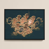 Tegen een diepe, mysterieuze achtergrond die doet denken aan oerbossen, barsten ingewikkeld versierde figuren los in een uitbarsting van oker, sienna en glanzend goud. De nauwgezette detaillering van hun sierlijke kostuums en hoofdtooien belichaamt het toppunt van Thaise culturele vakmanschap.
