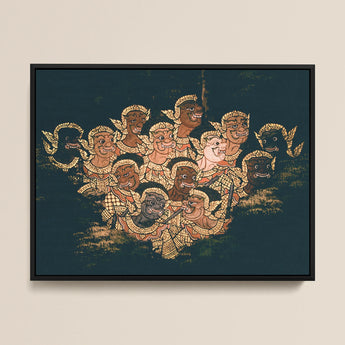 "Babes In The Woods" onthult een betoverend tapijt van Thaise mythologische kunst, die kijkers naar het hart van het Ramayana-epos transporteert. Dit prachtige ingelijste canvas pulseert met vitaliteit en toont een menigte van grillige ondersteunende personages in de kenmerkende stijl van traditionele Thaise schilderkunst.