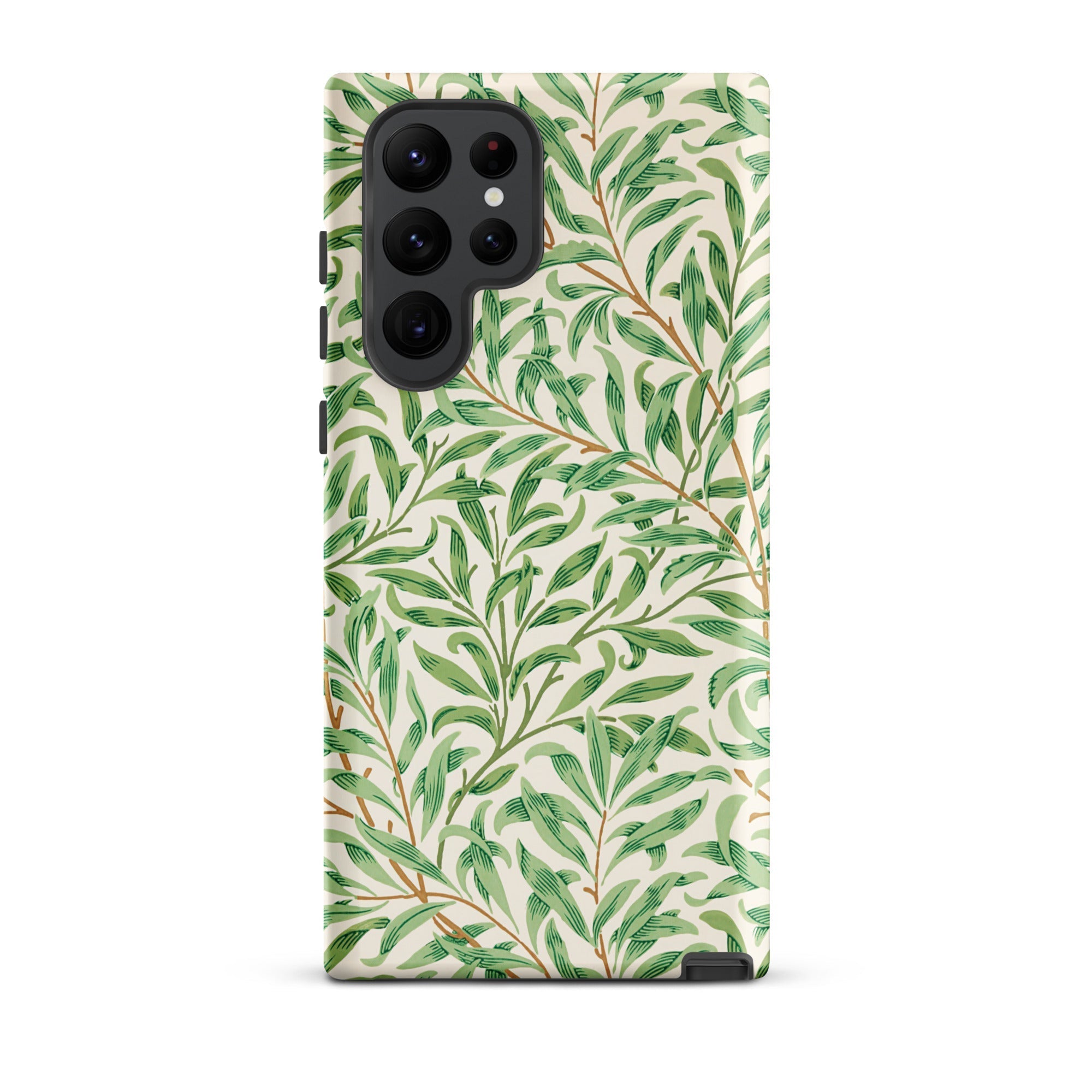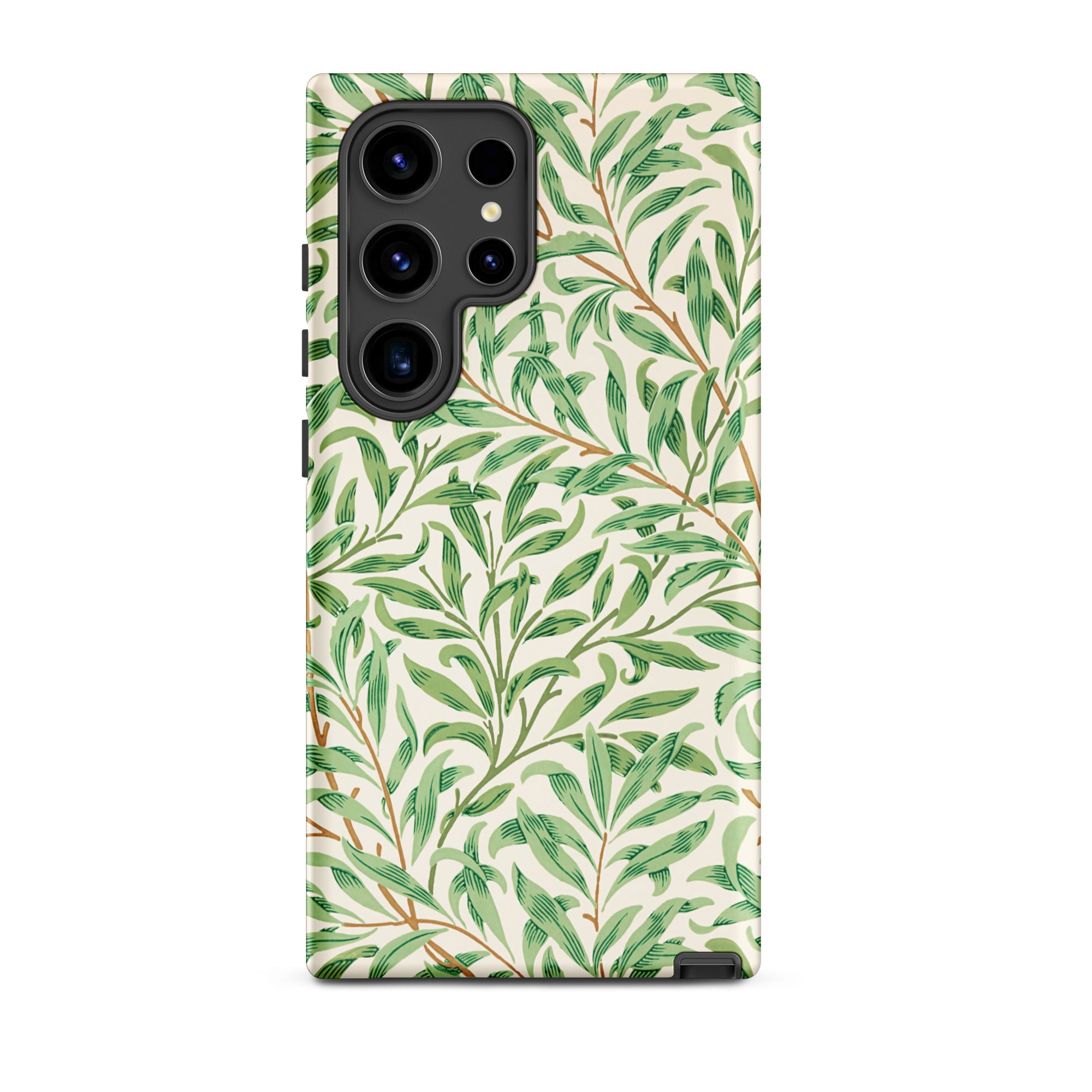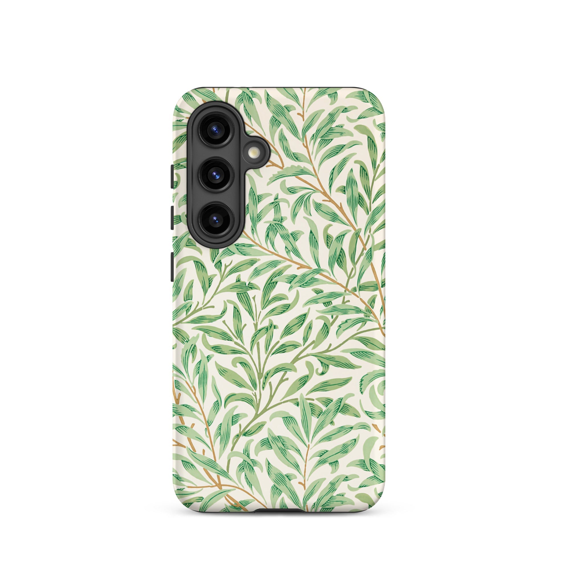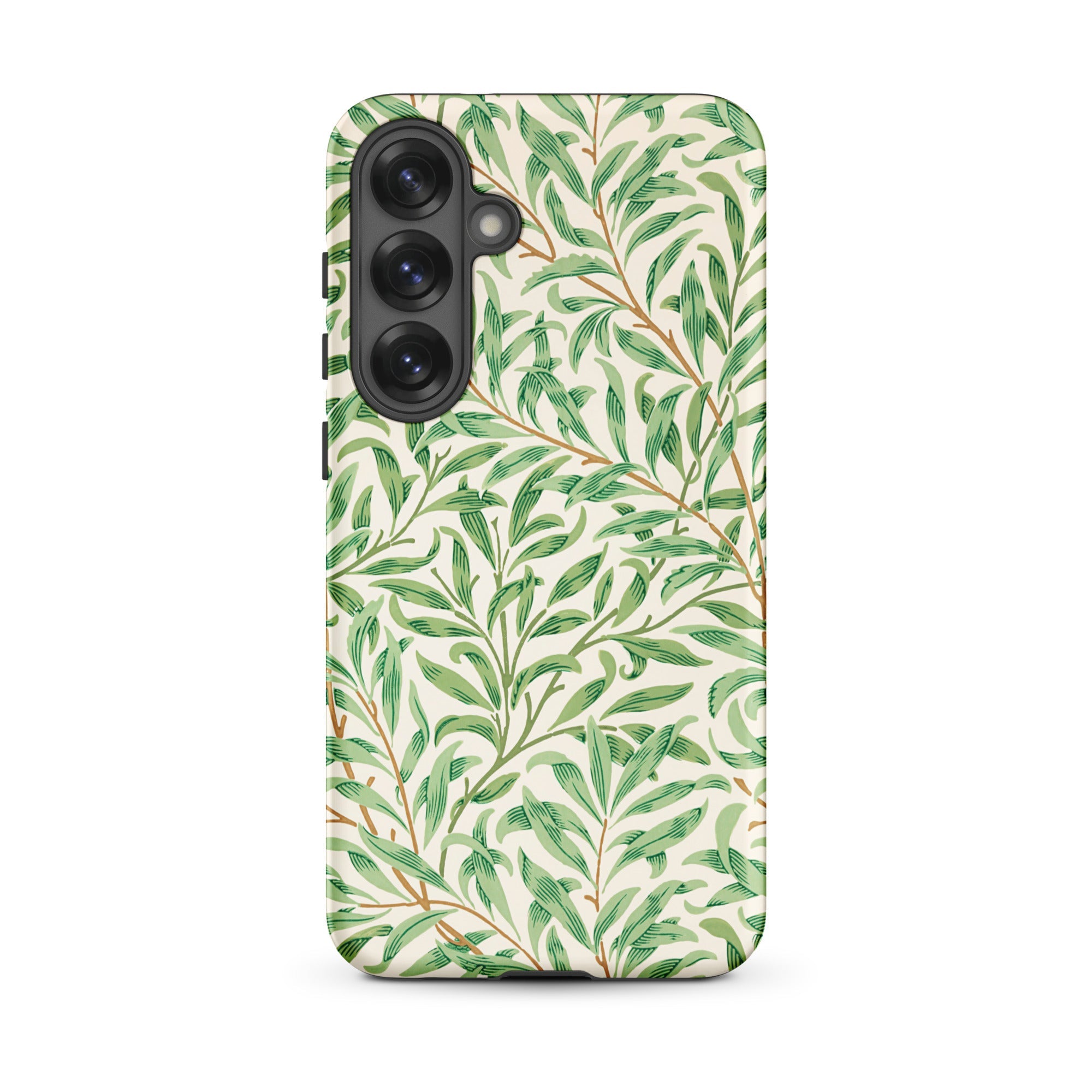 Hier, gedrukt op een Samsung-hoesje, wordt het patroon draagbare architectuur: Art Nouveau-gratie gewikkeld om je telefoon, met wortels diep in de 19e-eeuwse ontwerpvernieuwing. De soepele groenen verschuiven van salie naar schaduw, dooraderd met fijne omber stelen.