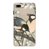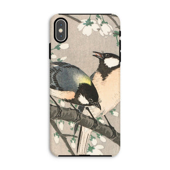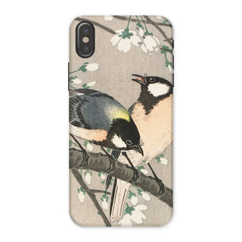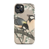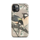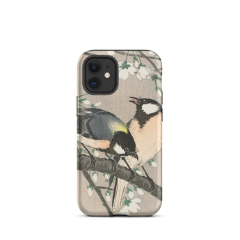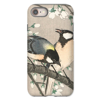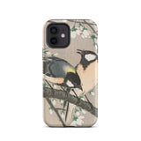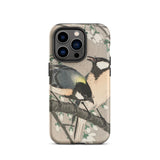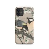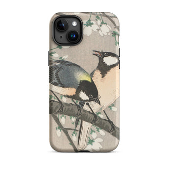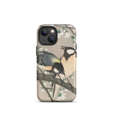 Zit je neer iPhone In een nest van Japanse kunstenaarschap met deze op Ohara Koson geïnspireerde zaak. Twee tieten, mollig en trots, balans op een kersentak, hun veren een symfonie van grijstinten en crèmes tegen een gedempte achtergrond.