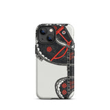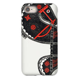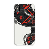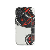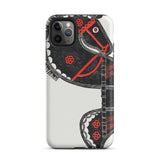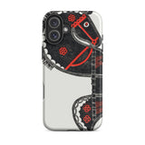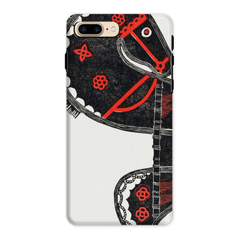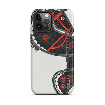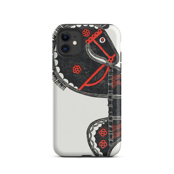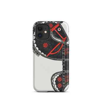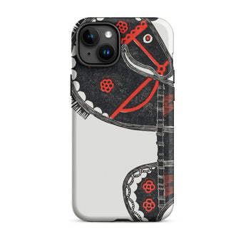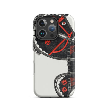 Deze beschermende schaal transformeert je apparaat in een canvas van culturele rebellie, waar een ceremonieel paard over het strakke wit danst, zijn vorm gesneden in inktzwarte lijnen en versierd met vurige rode accenten.