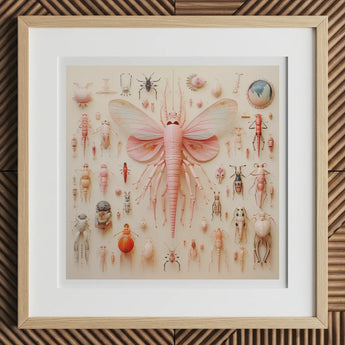 "Pink Mama Moth" revolutioneert revolutionering van xenoentomologische kunst en combineert naadloos digitaal vakmanschap met speculatieve evolutie. Deze boeiende print toont een kolossale, roosachtige Lepidopteran -matriarch, zijn roddelvleugels en gesegmenteerd lichaam dat de kloof tussen de insecten van de aarde en buitenaardse fauna overbrugt. De ingewikkelde anatomie van het exemplaar - een fusie van begrafenis bekendheid en buitenaardse biomechanica - werpt terrestrische classificaties uit. Omring van deze centrale figuur vormt een zorgvuldig samengestelde reeks fantastische wezens een taxonomisch tapijt, waarbij elke entiteit verwijst naar complexe buitenaardse ecosystemen.