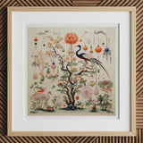 Deze boeiende "Queer Menagerie" presenteert een betoverend tableau van botanische en zoölogische fantasie. Gerecht in een delicate, vintage geïnspireerde stijl die doet denken aan de 18e-eeuwse naturalistische illustraties, toont het kunstwerk een levendig ecosysteem vol met exotische flora en fauna.
