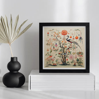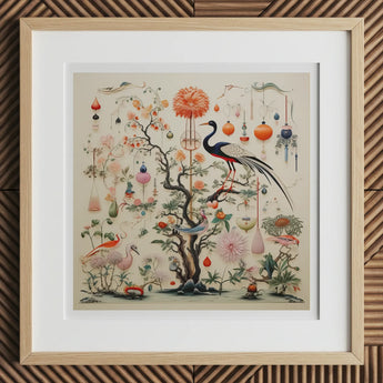 Dit stuk combineert meesterlijk elementen van traditionele Chinese kunst, Art Nouveau esthetiek en hedendaags surrealisme, wat resulteert in een visueel rijke verkenning van denkbeeldige taxonomie. De ingewikkelde details en symbolische beelden nodigen kijkers uit om zich onder te dompelen in dit fantastische rijk, waar natuur en kunstgrepen verweven zijn in een viering van diversiteit en verbeelding.