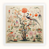 Een opvallende zwarte kraanachtig vogel Staat centraal, omgeven door een scala aan grillige elementen, waaronder sierlijke lantaarns, gestileerde bloemen en abstracte ornamenten. Het kleurenpalet, gedomineerd door warme sinaasappels en coole blues, creëert een harmonieuze maar toch buitenaardse sfeer.