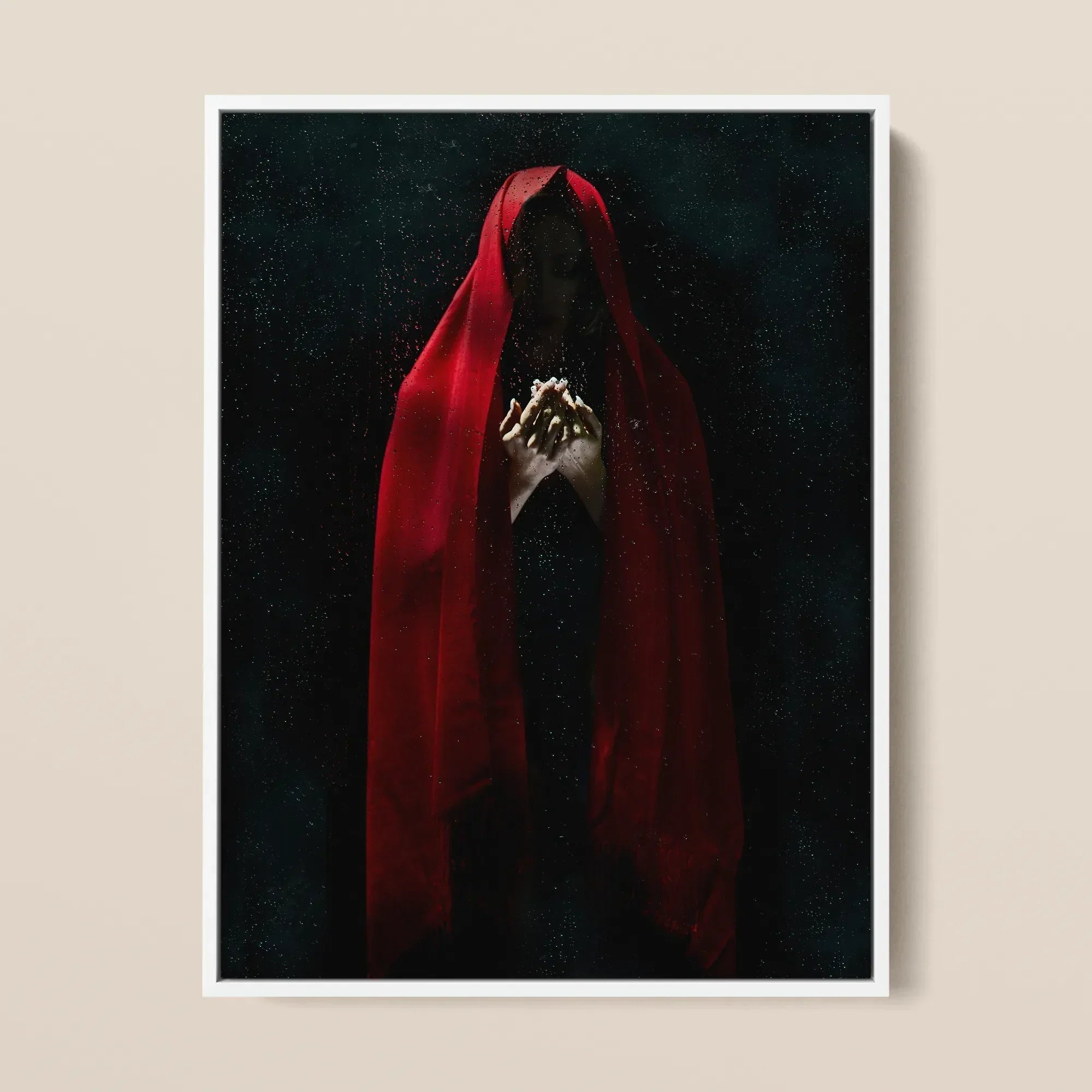 Haar mantel poelt als kolen die afkoelen in het donker. Deze heks, gebonden door scharlaken en geheimhouding, leunt naar een half-gezien licht dat geloof of verzet zou kunnen zijn. Een dunne film—regen, glas of droom—scheidt haar van ons, waardoor visie in ritueel verandert.