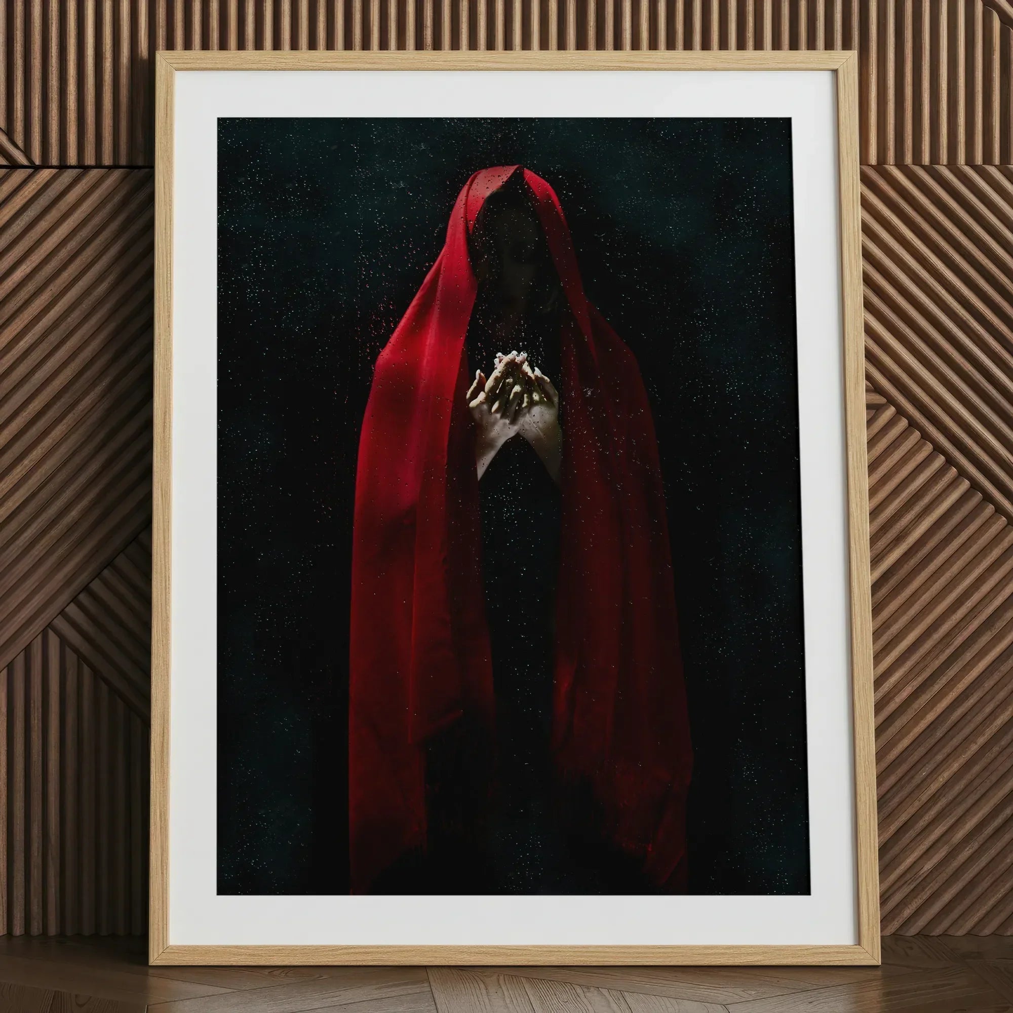 Een karmozijnrode mantel vangt het schemerige licht, zijn plooien verzamelen het gewicht van eeuwen. De heks staat binnen die stilte van schaduw en vermiljoen, de lucht dik als kaarsenrook. Achter de glans van glas vermenigvuldigt haar reflectie zich—een sluier tussen werelden, noch spiegel noch raam.