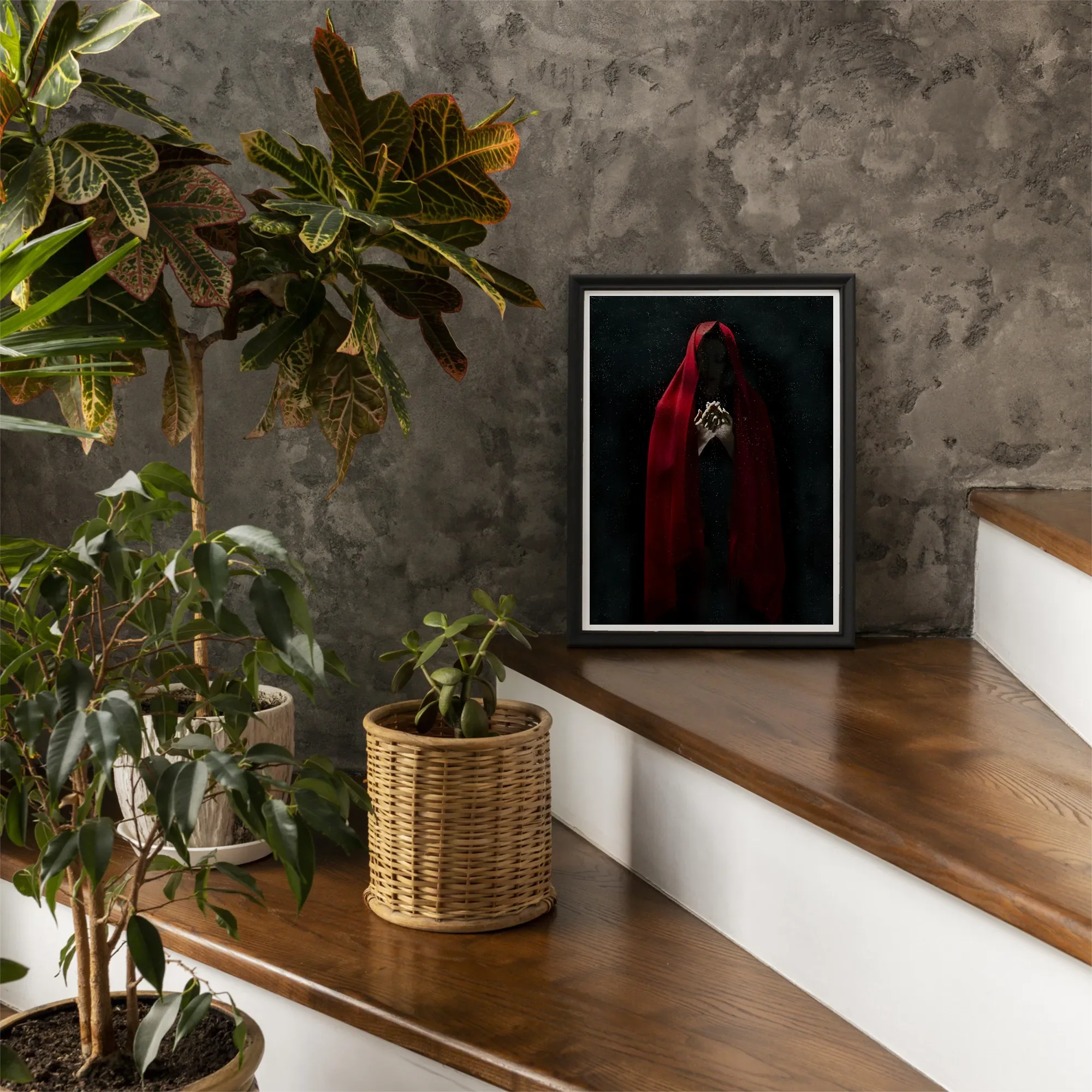 Pigment drukt als gedroogd bloed over linnen, herinnerend aan de symbolistische obsessie en de spookachtige vrouwen van Redon en Böcklin. De compositie brandt met occulte zwaartekracht: clair-obscur verbonden aan het ritueel van zien. Elke contour zoemt met voorouderlijk vakmanschap, elke tint een spoor van alchemie.