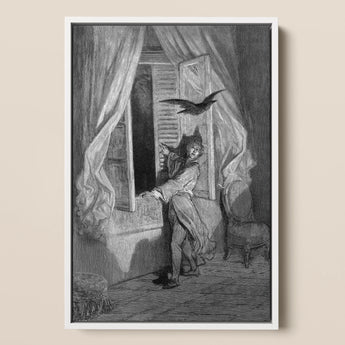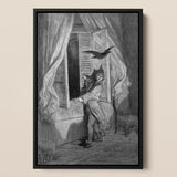 Maanlicht breekt in een geleerde's kamer waar wanhoop dikker wordt als oude inkt. Doré geeft Poe's visie weer met genadeloze precisie: verwrongen draperieën, skeletachtig meubilair, een raam dat gaapt naar eindeloze afwezigheid.