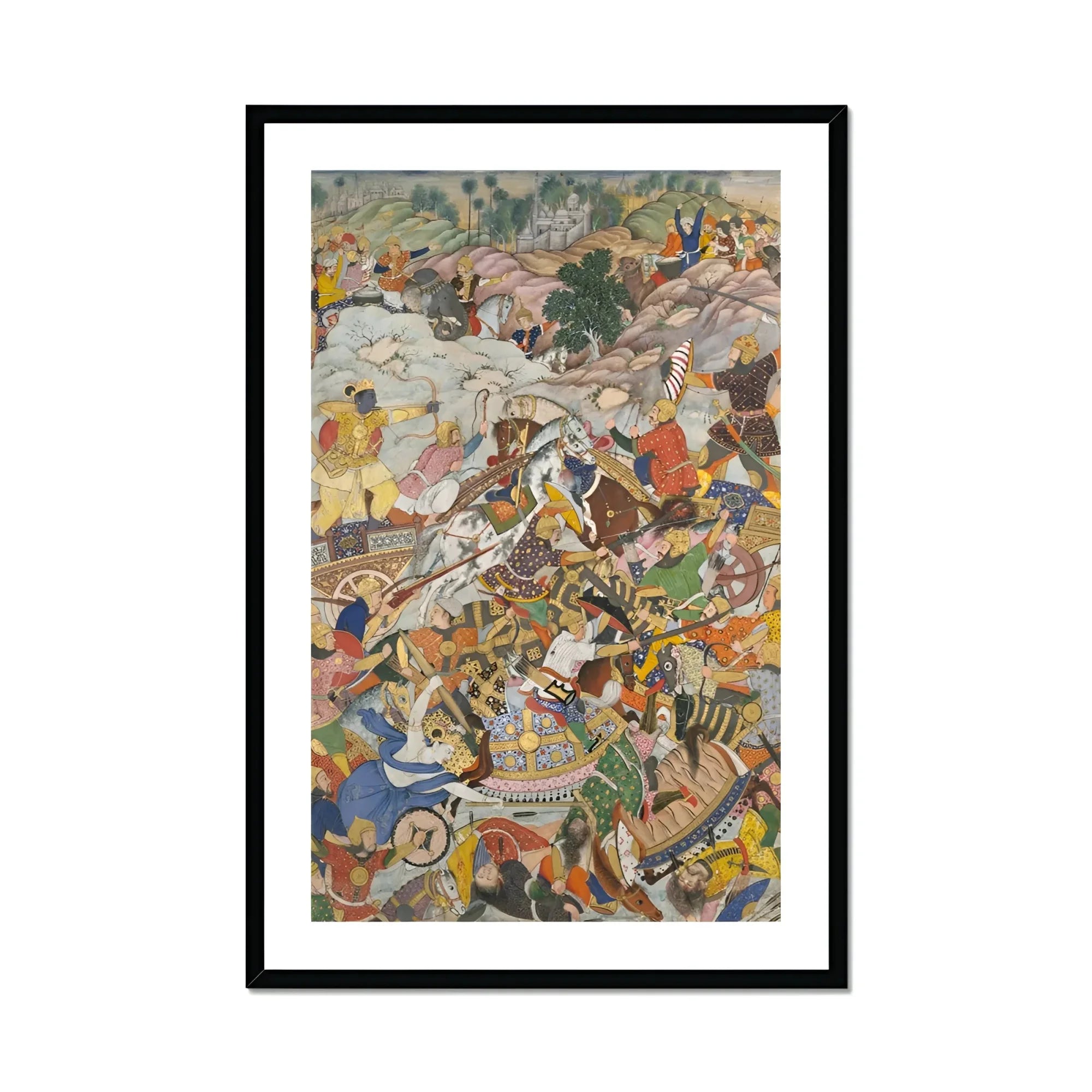Een verspreiding van sabels, saffraan en stilte brak uit. Een Harivamsa-miniatuur, Krishna & Balarma die de vijand bevechten, ontploft over de pagina in een juweelachtige tumult. Elk figuur is bevroren midden in de belegering, hun gezichten uitgehouwen met een woede die te oud is voor taal. Olifanten dringen door de nevel als gepantserde moessons. Hoefslagen stijgen op. Trompetten krullen in vlammen.