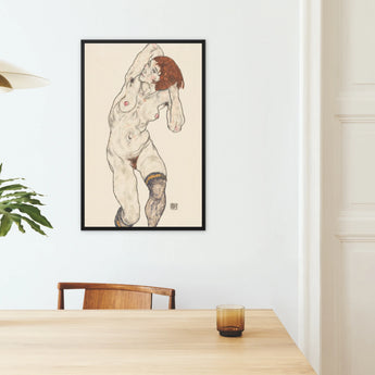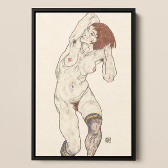 Verlies jezelf hiermee in Schiele's rauwe, niet -apologetische visie ingelijst canvas Afdrukken van "naakt in zwarte kousen." De kenmerkende vervormde vormen en expressieve lijnen van de kunstenaar leggen een roodharige figuur vast in een provocerende pose, haar lichaam draait sensueel tegen een grimmige achtergrond. Je zult worden gefascineerd door het contrast tussen de bleke, langwerpige ledematen van de figuur en de grimmige zwarte kousen die haar benen accentueren.