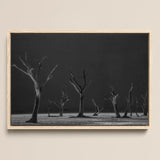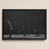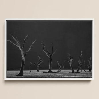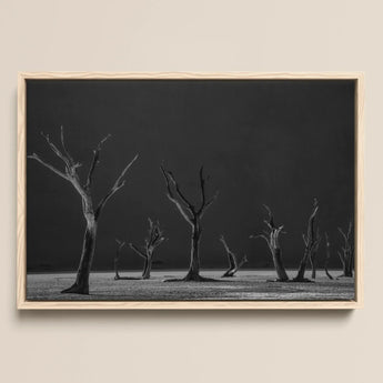 In deze monochrome woestijn van luchtloos licht rijzen dode acaciabomen in een vallei tussen de duinen in het Namib-Naukluft Park in Namibië — als houtskoolschetsen die in de eeuwigheid zijn verschroeid. Elk ledemaat breekt tegen de leegte, een relikwie van oude droogte waar tijd hars in schaduw verhardde.