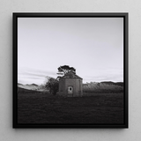 De foto vouwt architectuur in herinnering, de landelijke woning lost op richting abstractie. Zwarte tonen nestelen zich als as over de daklijn, terwijl bleke dampen over een horizon drijven die namen vergat.