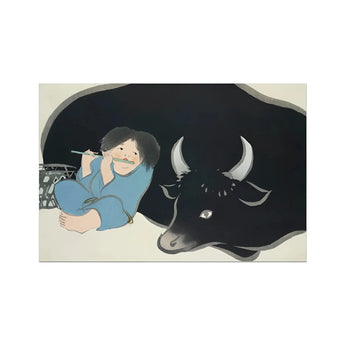 Gekruld in de inkt-donkere silhouet van de os, leunt de jongen in het blauw zachtjes in de stilte. Zijn bamboefluit rust net onder zijn lippen, zijn adem opgeroepen, melodie zwevend in de stilte tussen gedachte en geluid. Het gehoornde hoofd van de os buigt zich, luisterend. Zijn iris, als een enkele penseelstreek van nat obsidiaan, kijkt naar je.