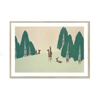Vijf herten, schaduwstil, staan en knielen onder een stilte van teal-groene dennen, waar de lucht vervaagt in een zacht niets en de tijd zijn eigen naam vergeet. Kamisaka Sekka's “Deer” beeldt het bos niet af als habitat, maar als drempel. Waar vorm suggestie is, en stilte beweegt in weloverwogen penseelstreken. De bomen, geabstraheerde kolommen van koel viridiaan, gebaren als gehulde wachters; hun stammen zijn berkegrijs en lichtjes wazig, alsof herinnering ze schilderde.