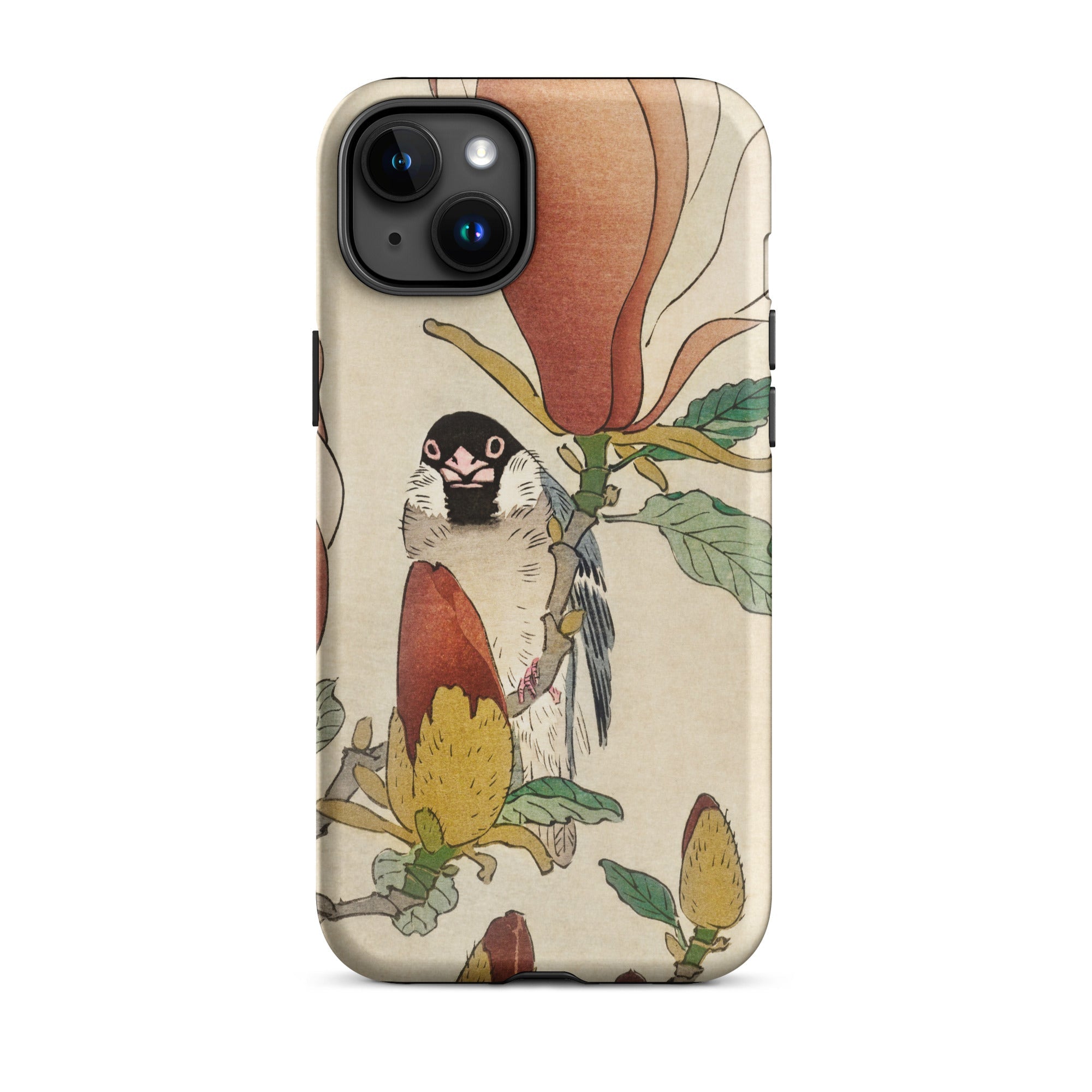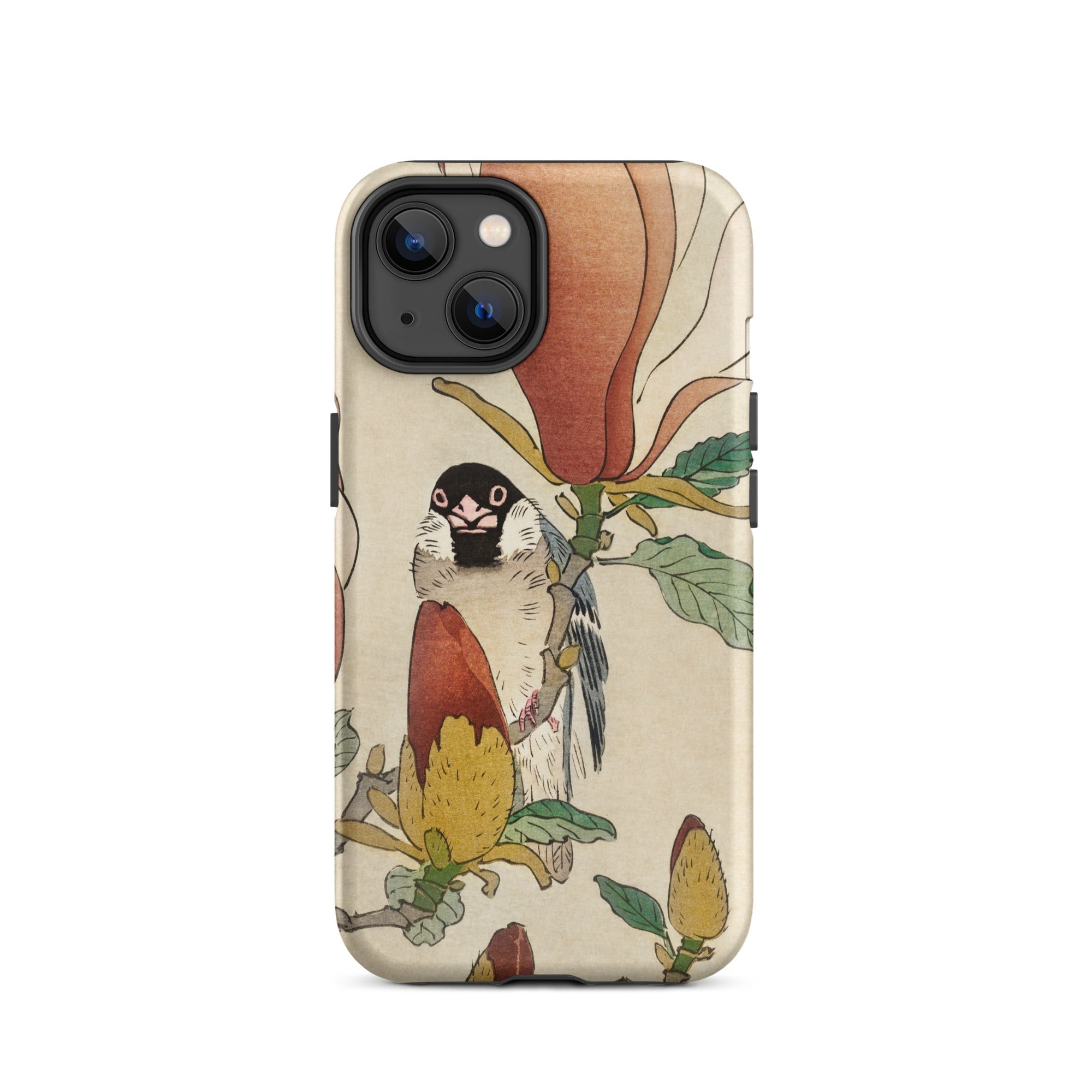 Dompel jezelf onder in Ohara Koson's betoverende kachō-e kunst met deze iPhone hoes. Een delicate mus zit te midden van weelderige magnoliabloesems, belichamend de essentie van Japanse natuurafdrukken.