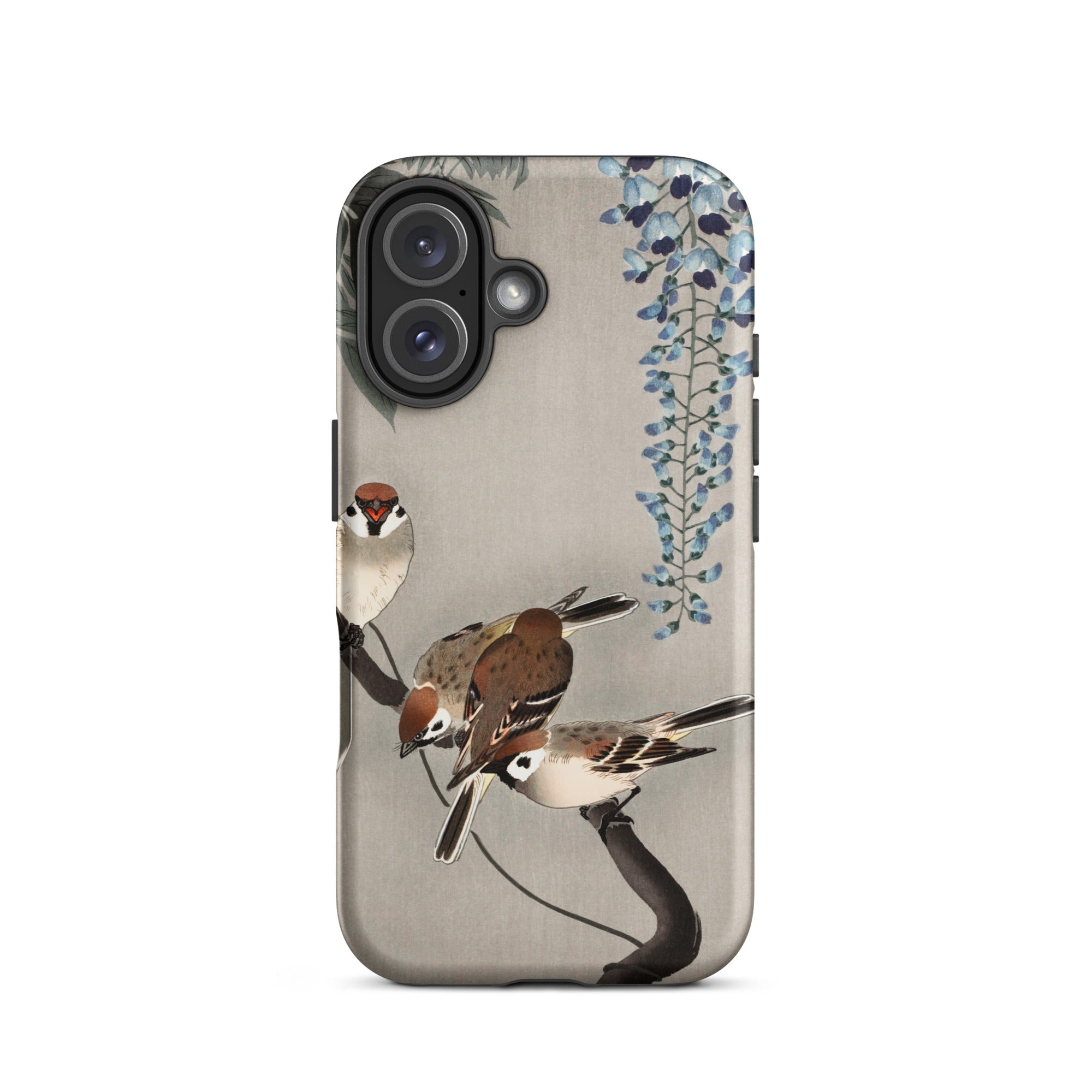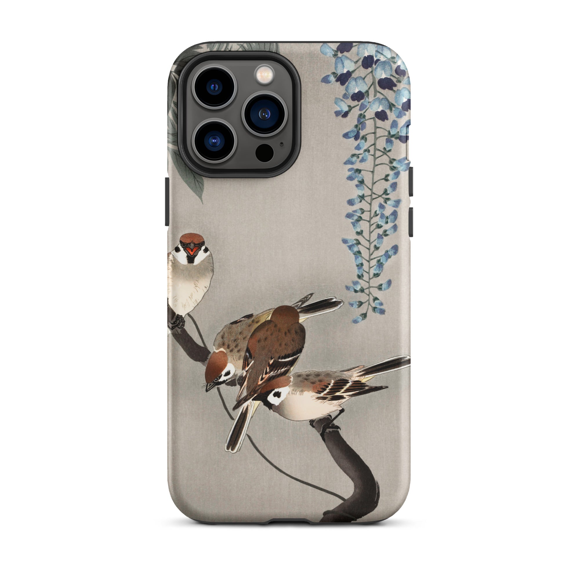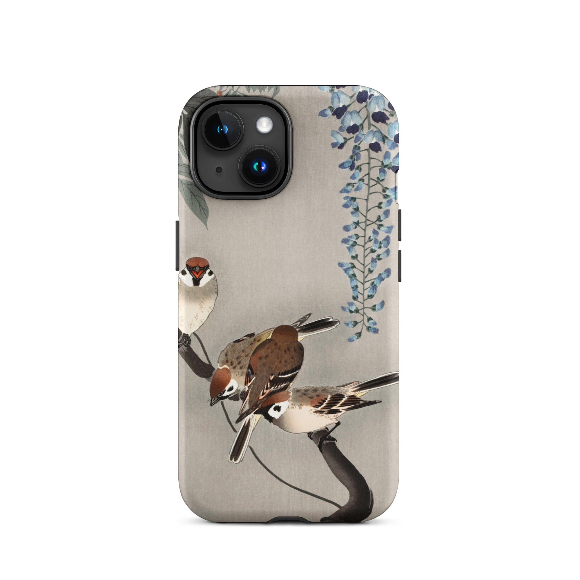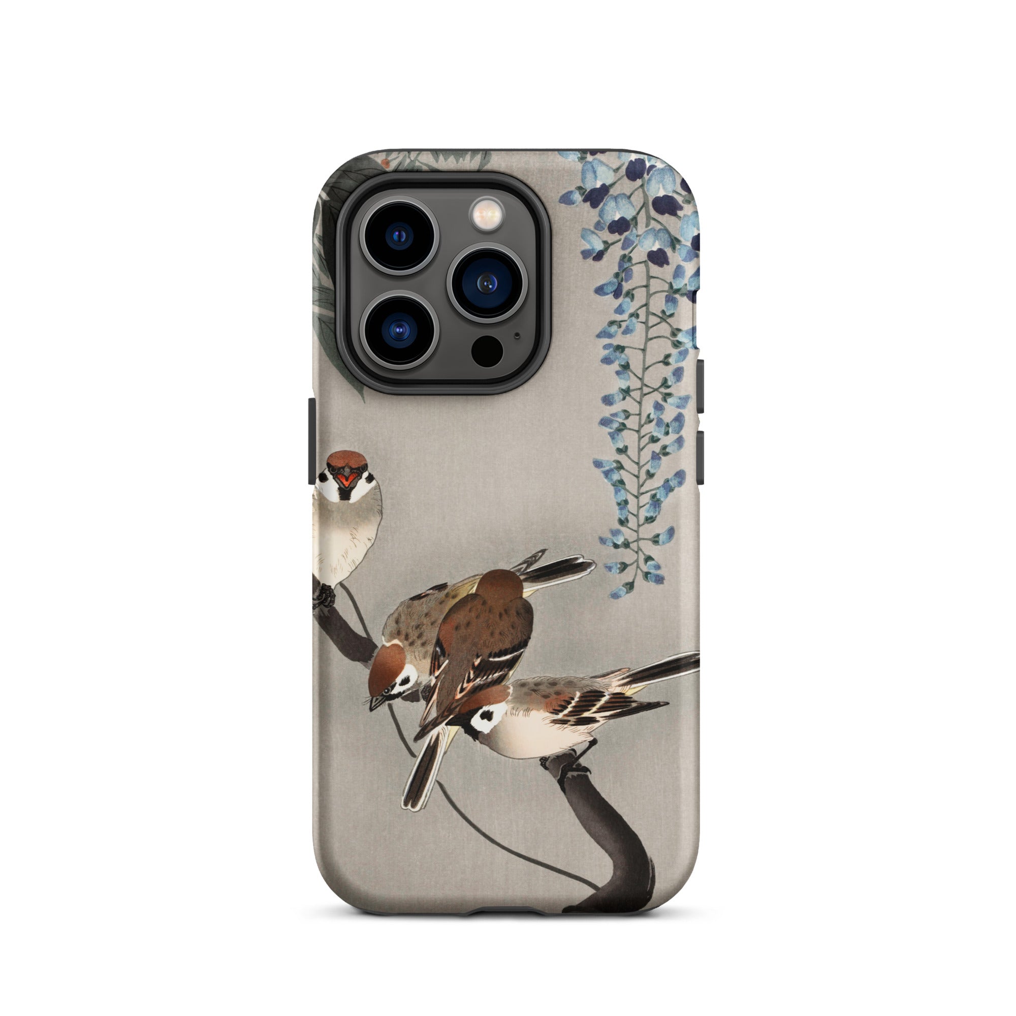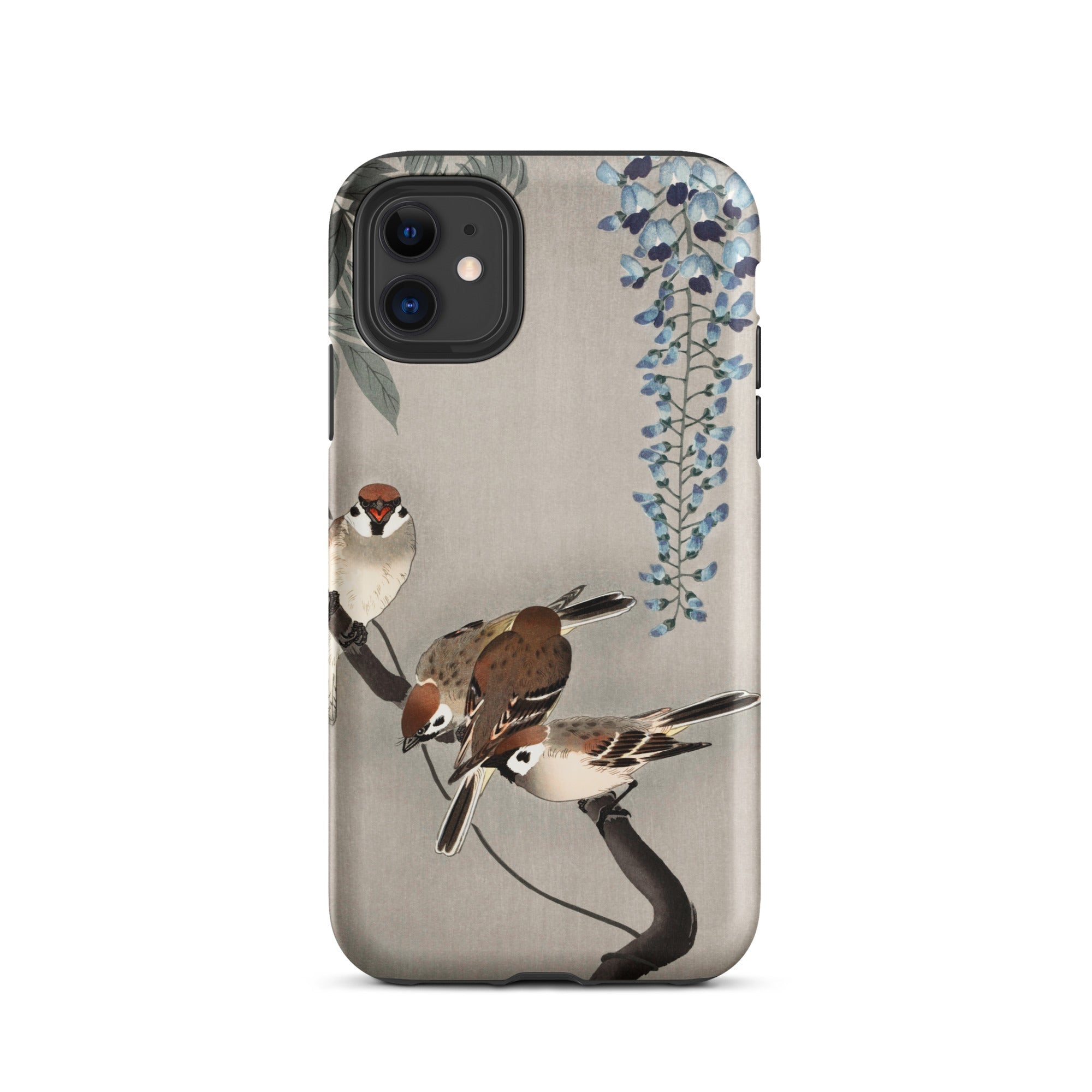 Zit je neer iPhone In een Japanse tuin van verwondering met deze op Ohara Koson geïnspireerde zaak. Mussen landen op inktstakken, hun veren een studie in delicaat penseelwerk. Wisteria cascades in etherisch blauw, elk bloemblad een gefluister van het beheersing van de scheenhanga.