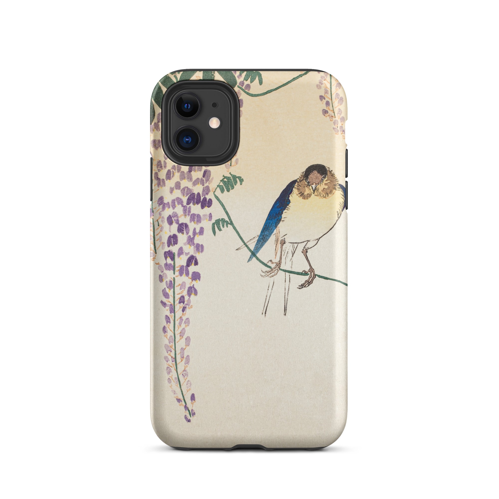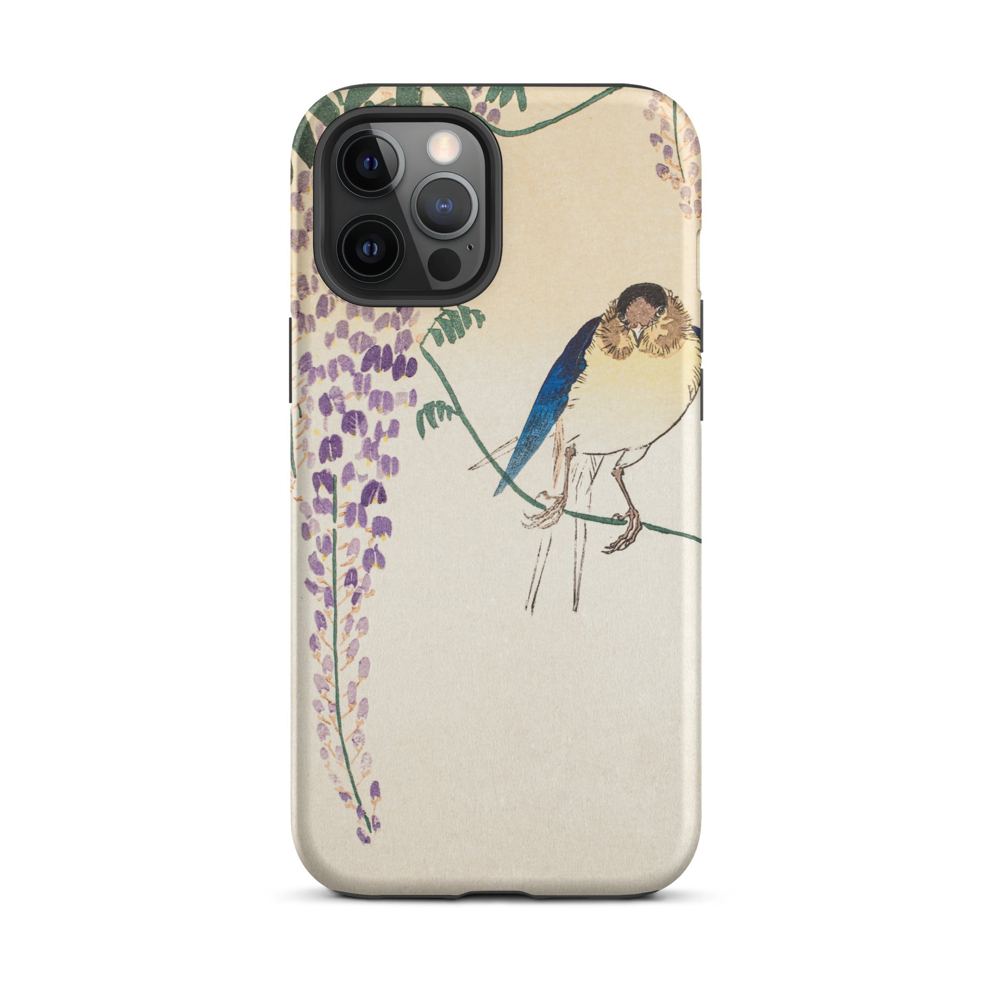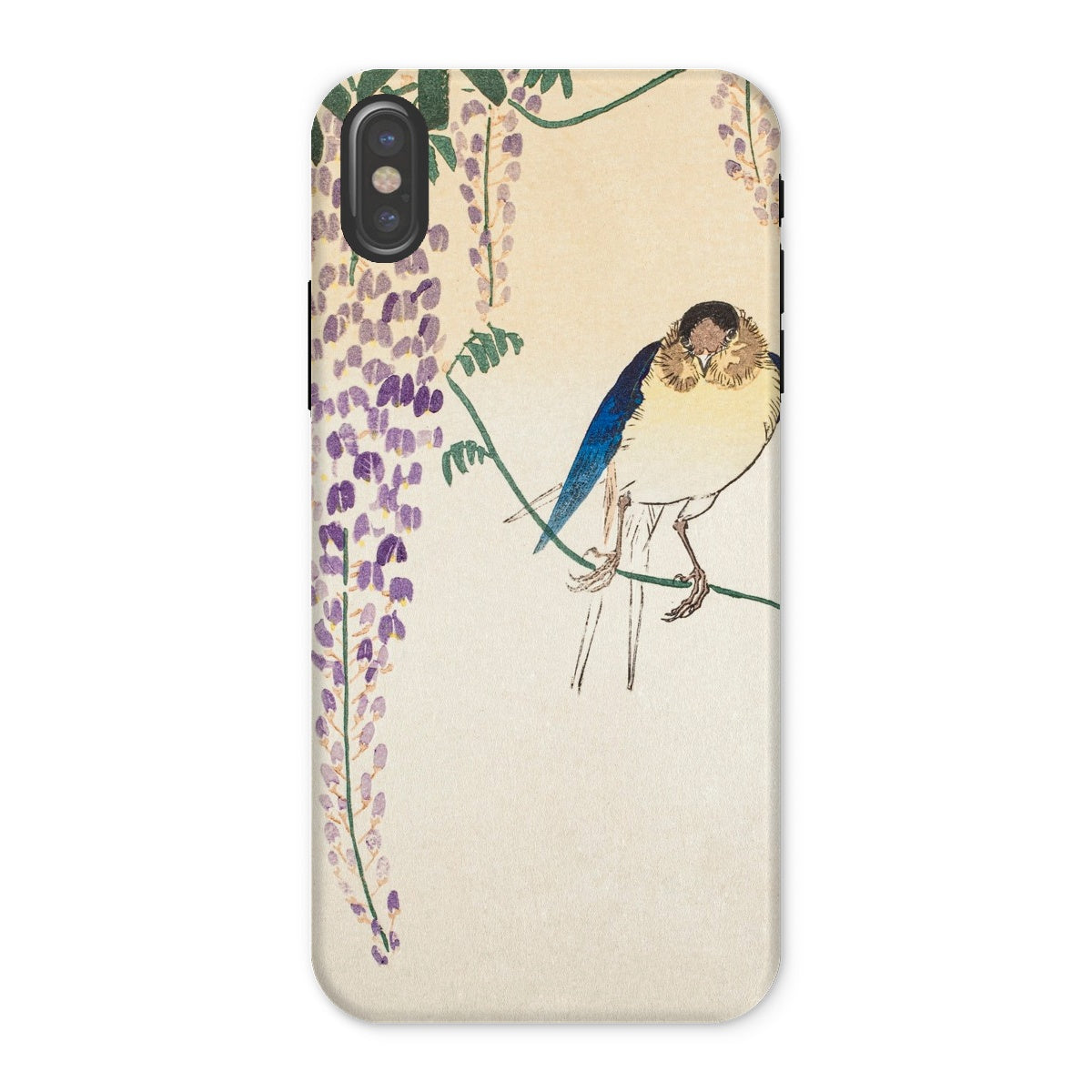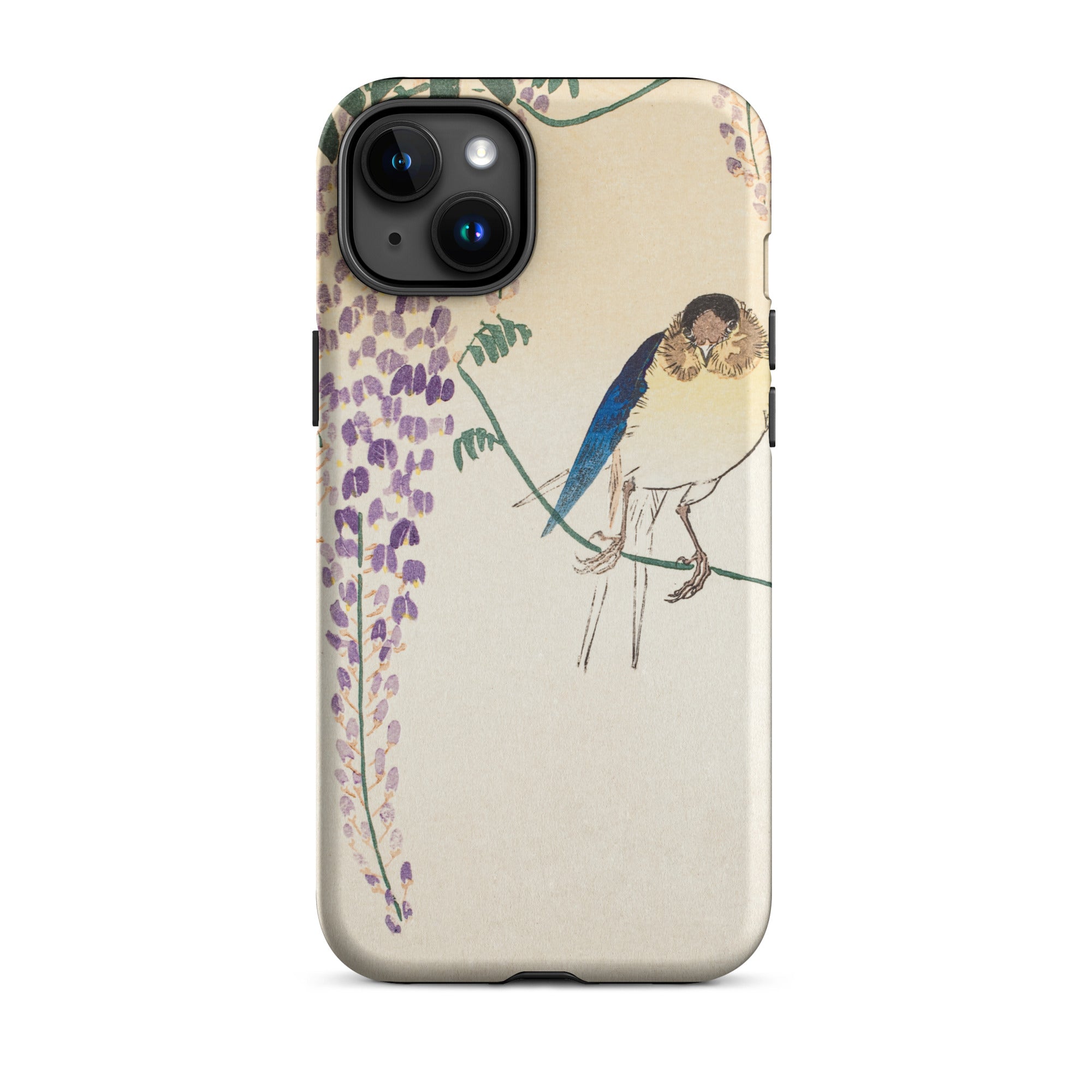 Temidden te midden van Wisteria's trapsgewijze lila, gloeit de sapphire -verenkleed van een zwaluw. Dit iPhone Case toont de beheersing van Ohara Koson van Kachō-e, de Japanse kunst van vogels en bloemen. Zijn delicate penseelstreken veroveren vluchtige schoonheid, balanceren realisme met poëtische genade.