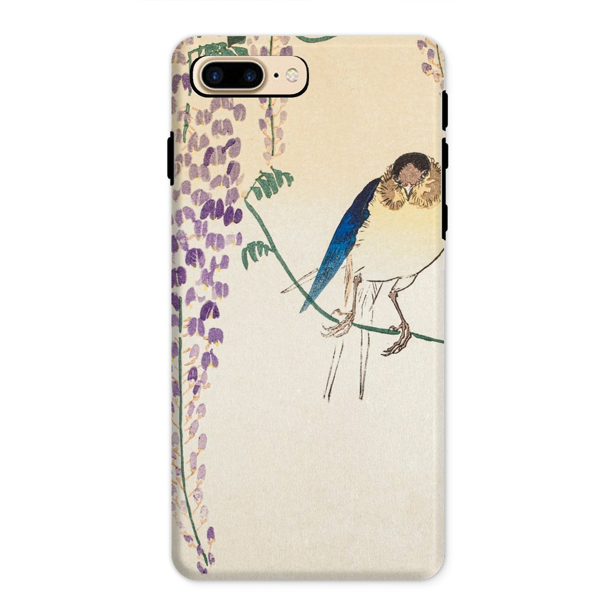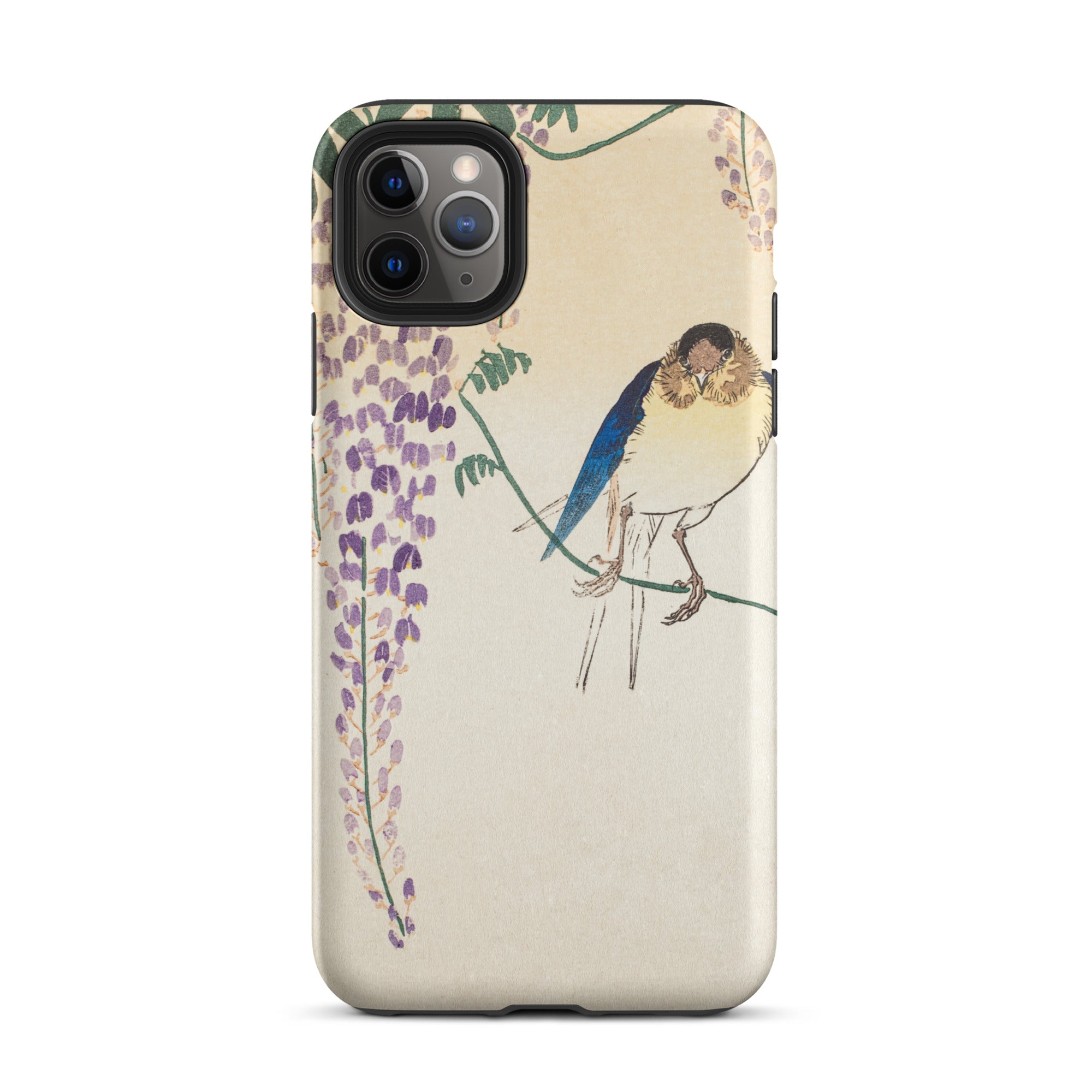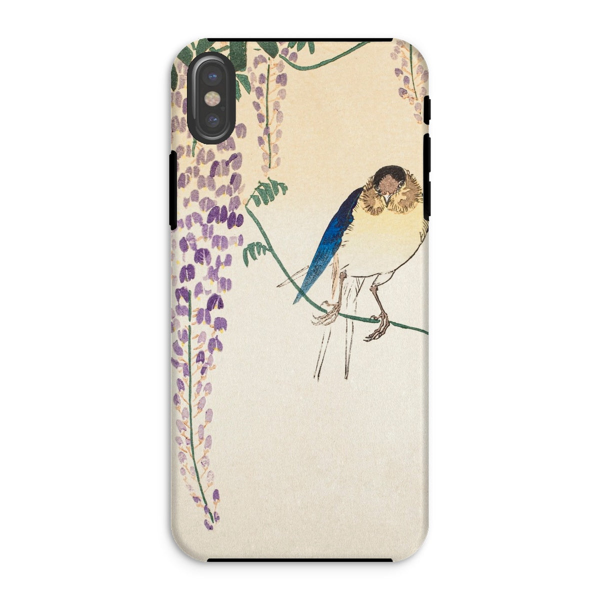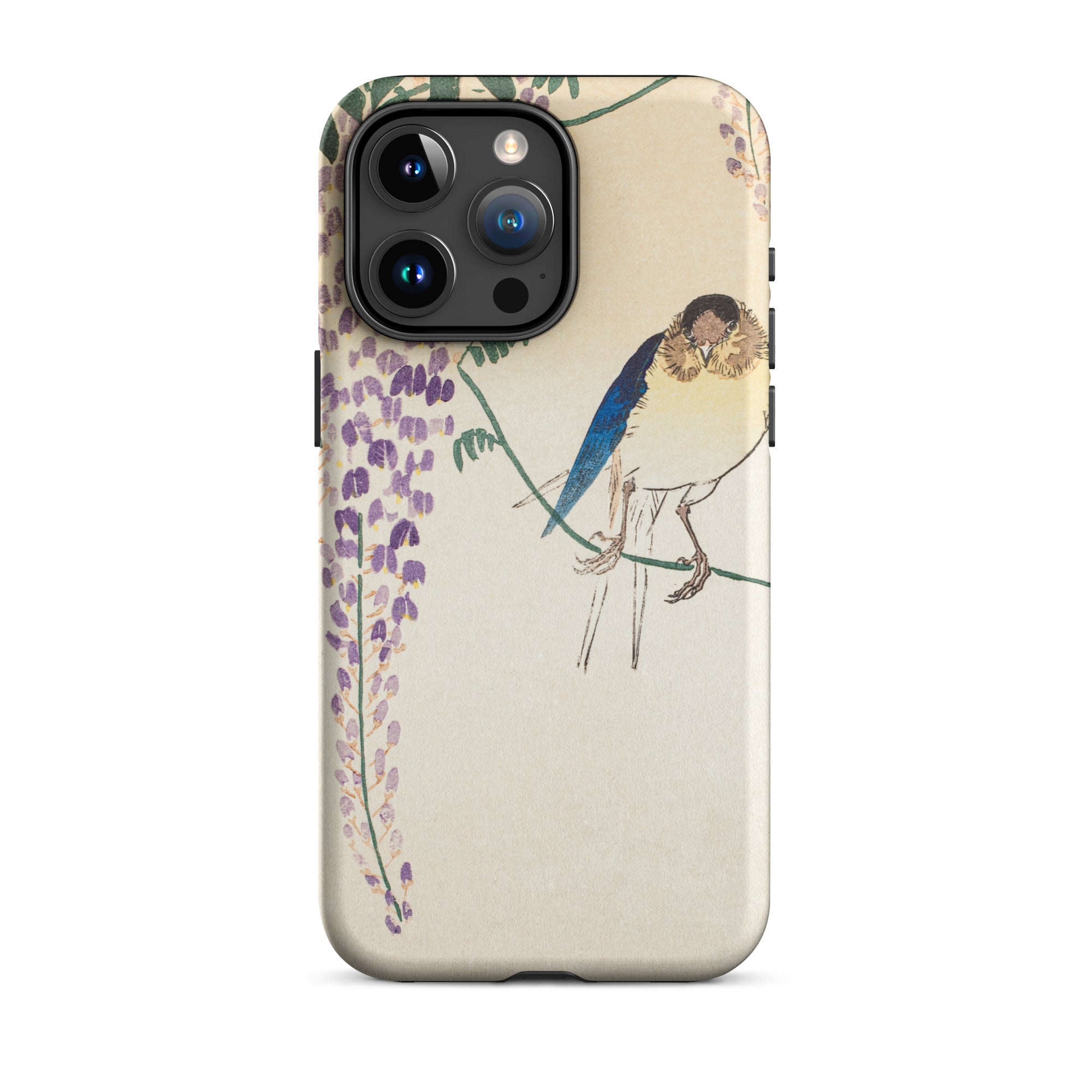 Temidden te midden van Wisteria's trapsgewijze lila, gloeit de sapphire -verenkleed van een zwaluw. Dit iPhone Case toont de beheersing van Ohara Koson van Kachō-e, de Japanse kunst van vogels en bloemen. Zijn delicate penseelstreken veroveren vluchtige schoonheid, balanceren realisme met poëtische genade.
