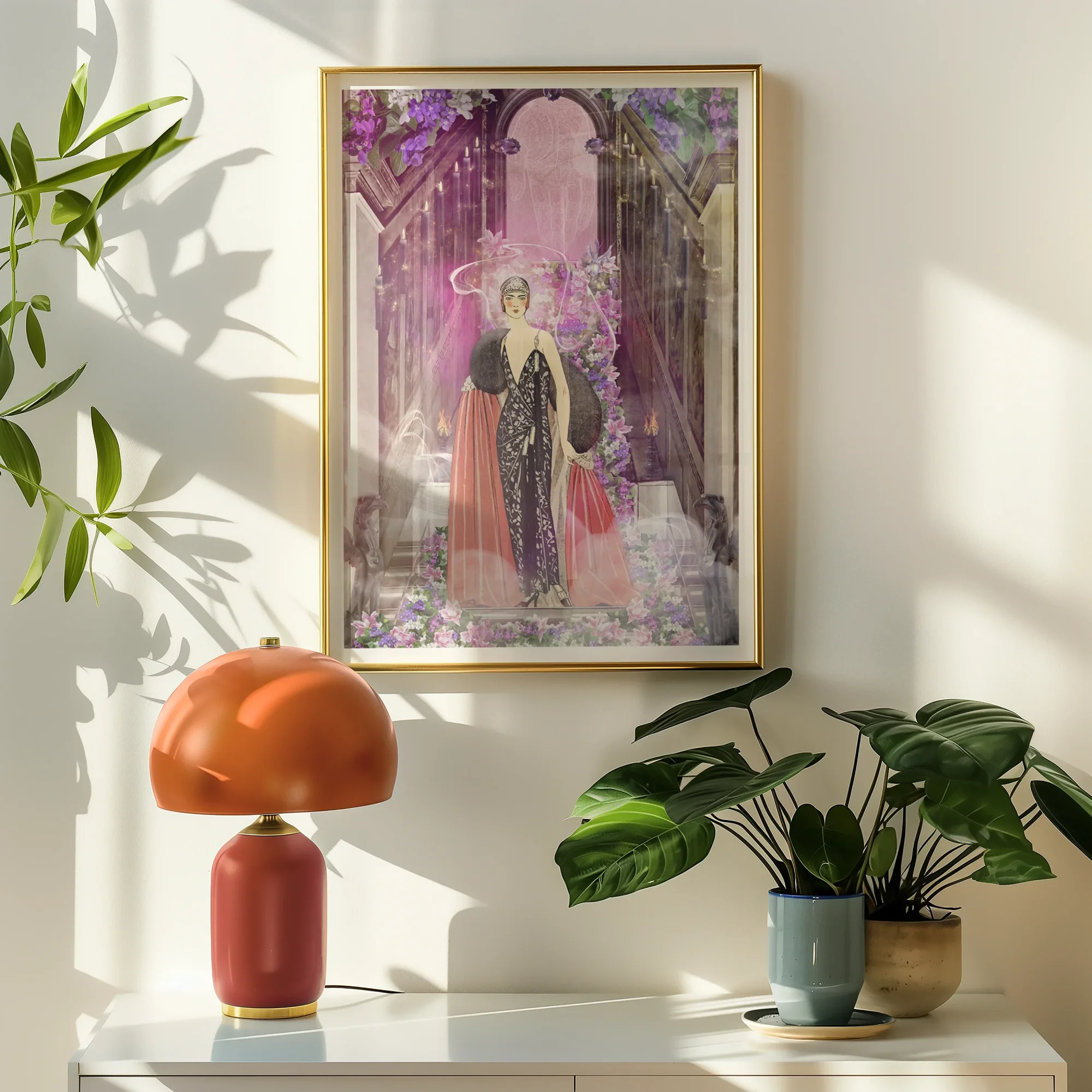 Stap in het rijk van "Princess Rhea", een collage kunstafdruk Waar een Titan's misschien Jazz Age -glamour ontmoet. Je wordt in een wereld geduwd waar Cosmic Power zichzelf drapeert in zijde en pailletten. Rhea komt een surrealistisch Sorceress Reborn. Omlijst door een boog die pulseert met mythologische energie en een raadsel alleen Reah weet het antwoord op.