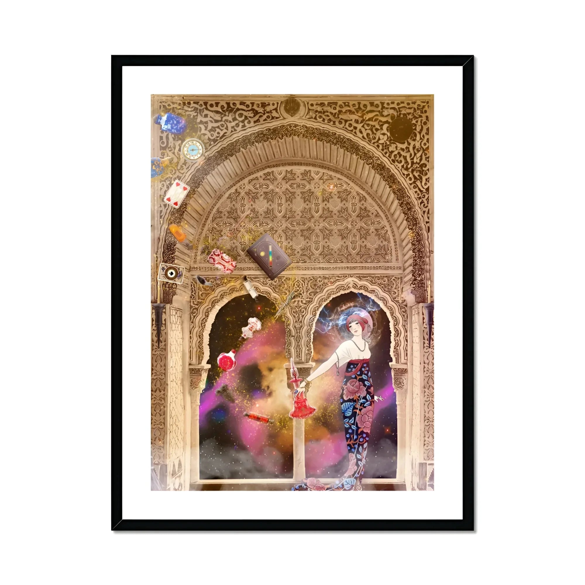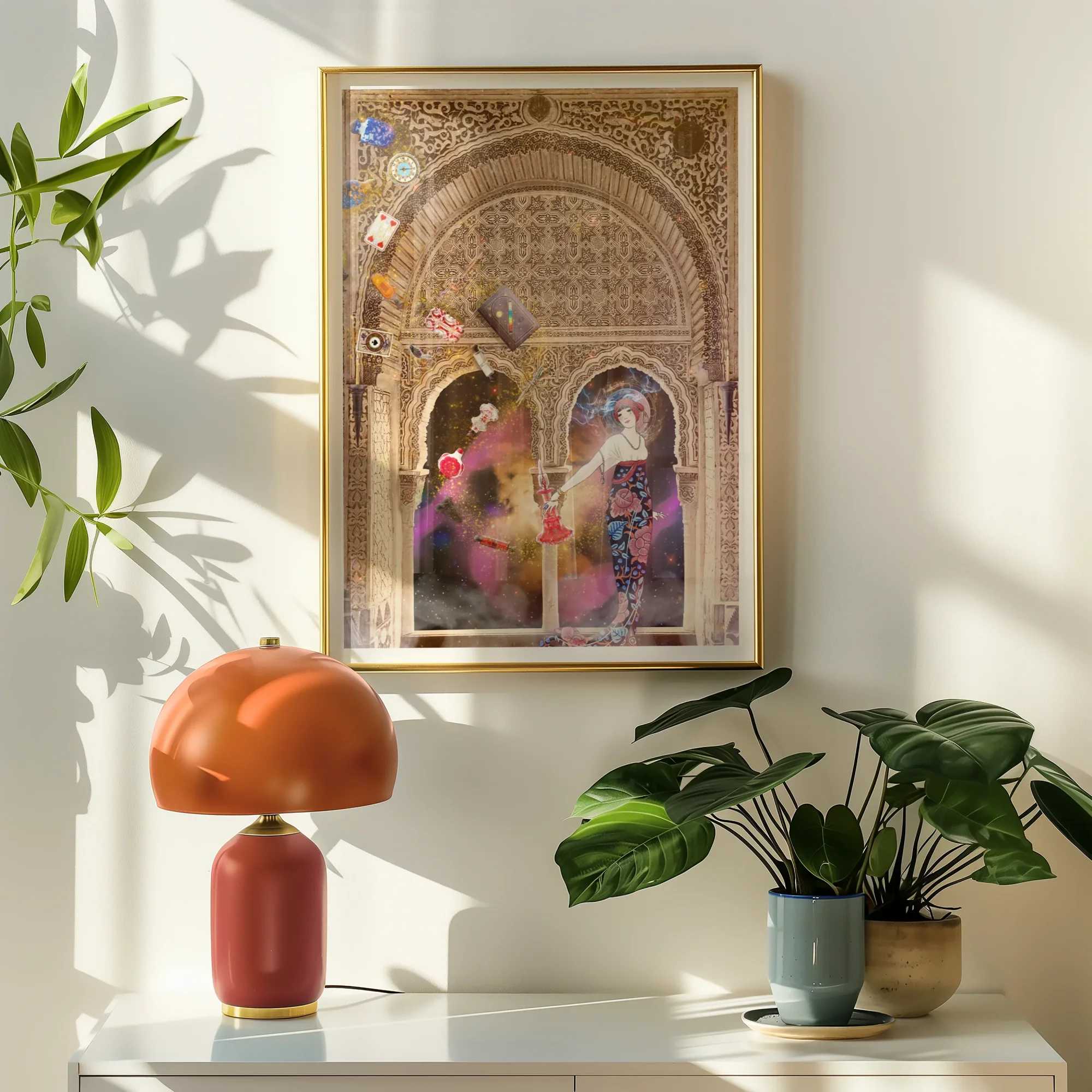 Ingewikkelde islamitische patronen maken plaats voor nevelige explosies van kleur terwijl ze haar spreuk werpt tussen sierlijke Moorse bogen. Thea staat klaar terwijl je getuige bent van deze botsing van werelden - oude architectuur omlijst een poort naar de sterren. Deze surrealistische collage kunstdruk die je uitnodigt in een rijk waar Griekse mythen dansen met galactische dromen.
