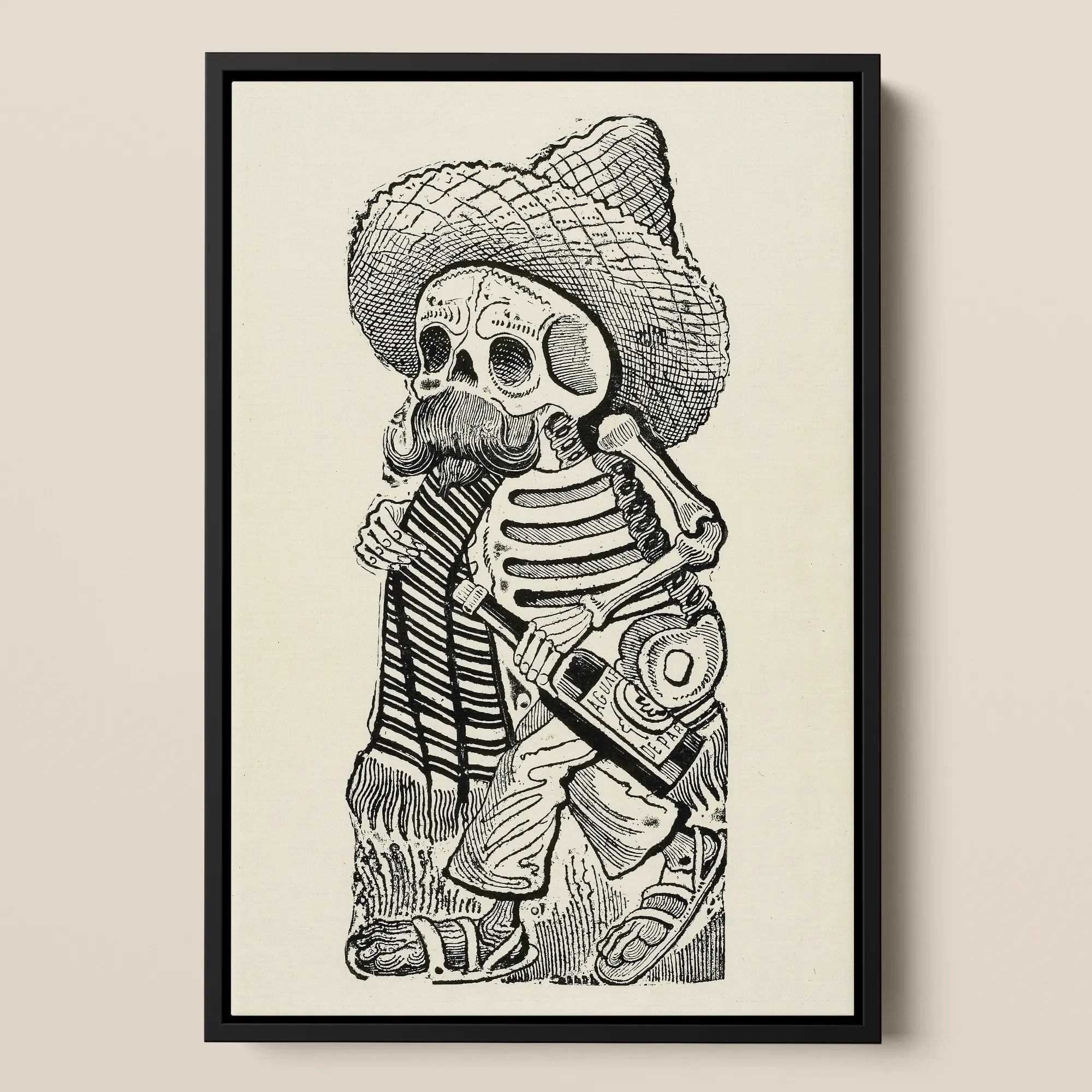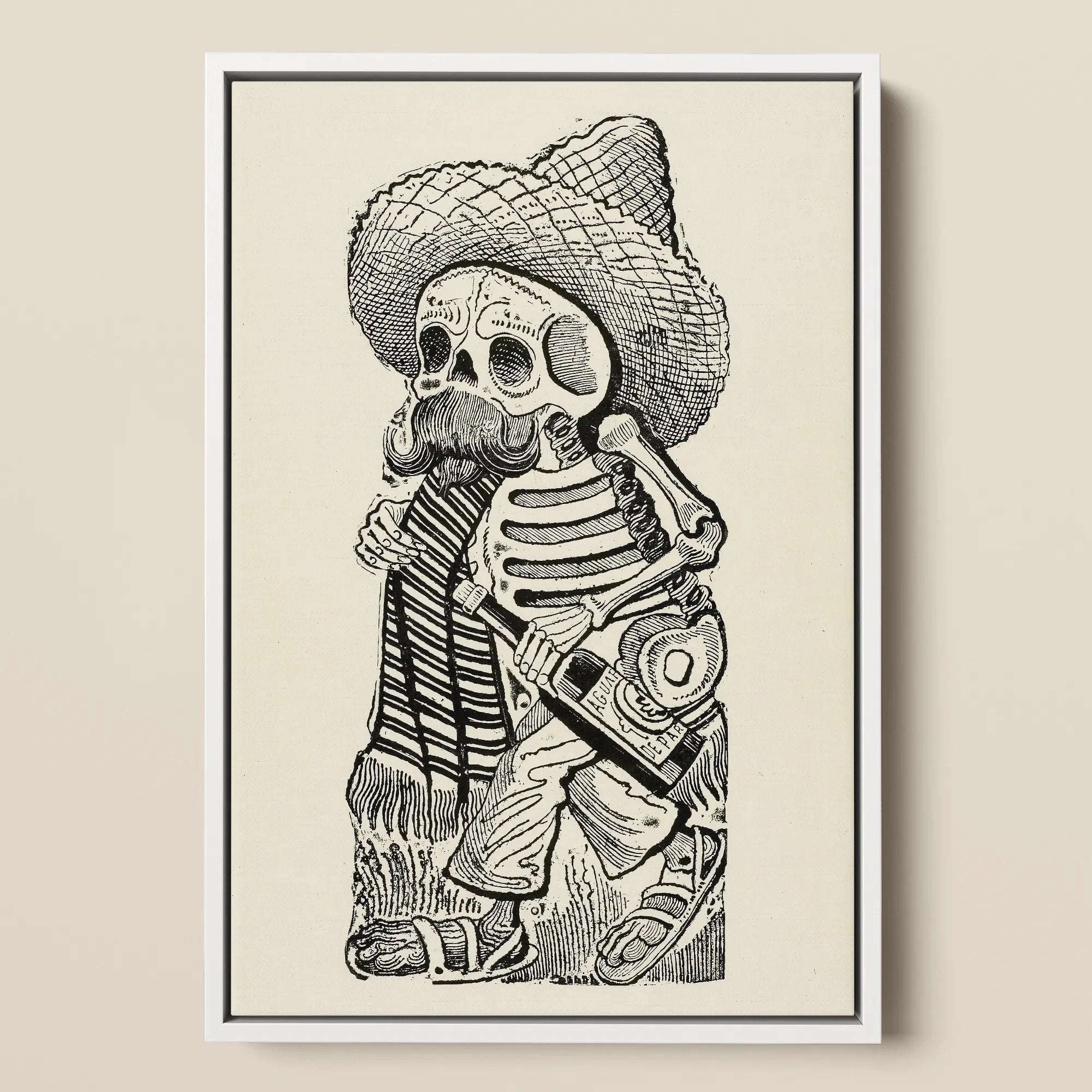 Posada's skeletale Madero sjokt door de eeuwigheid, ribben rinkelen als de tandwielen van de revolutie. De poncho valt in een grillig ritme, gestikt met vermoeidheid en satire. Een fles kantelt naar het graf, gelabeld met bijtende humor—vloeibare moed voor het hiernamaals.