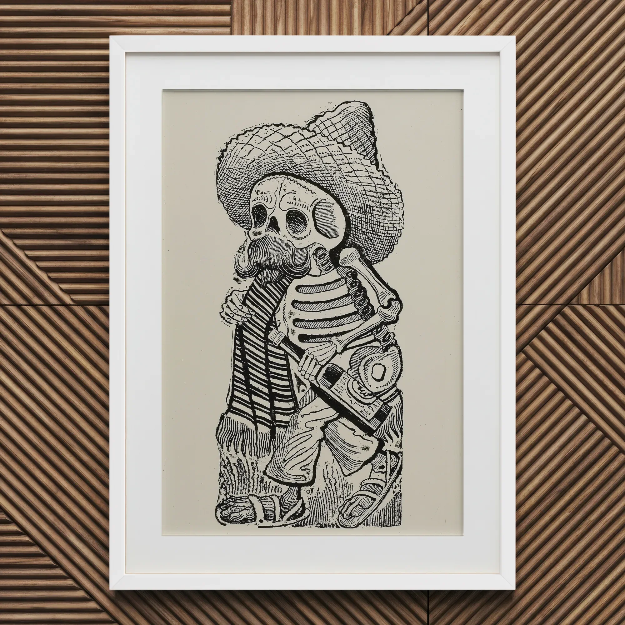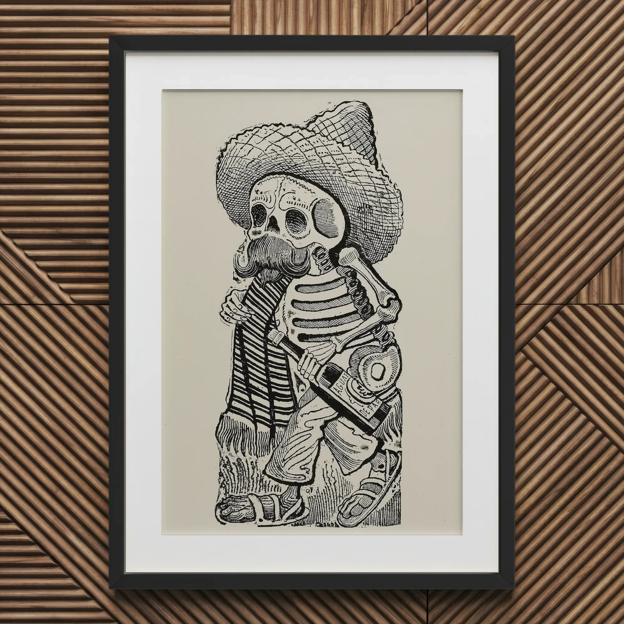 Deze calavera draagt Madero's reformistische schaduw in bot en rand. Posada etste hem met bijtende humor: ribben als hekplanken, poncho gestreept in verdriet, pistool bungelend uit de holte van zijn greep.