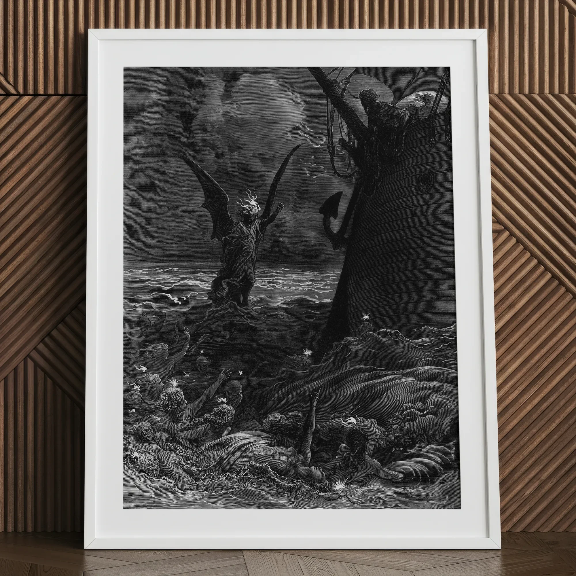 Van plank tot wolk, elke textuur draagt Doré's chiaroscuro theologie: openbaring geboren uit verval. De compositie houdt zijn adem in tussen het terugtrekken van de hemel en de komst van de hel, waar de zee zelf geweten zichtbaar maakt.