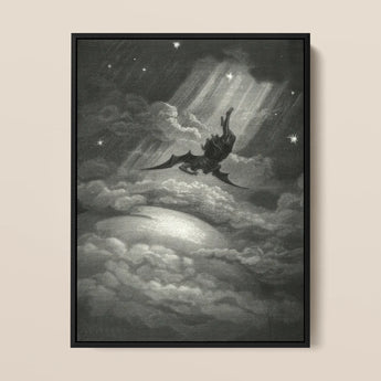 Licht breekt door het firmament, waardoor wolken veranderen in gesmolten perkament. Lucifer stort neer, vleugels snijden door de ether. Doré legt de val vast met chirurgische helderheid: spieren geëtst in schaduw, arrogantie die in zwaartekracht instort.