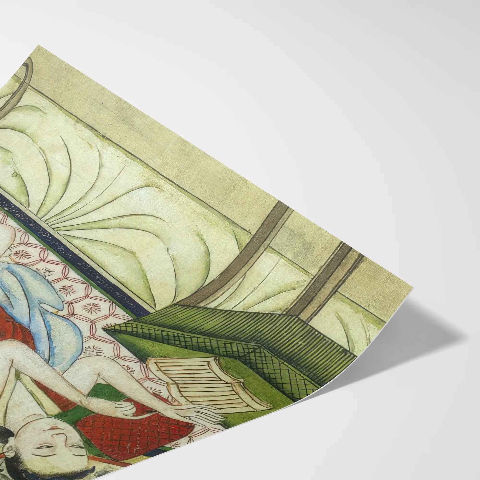 Niets in het kader schreeuwt; alles luistert. De terughoudendheid van de schilder wordt zijn eigen verleiding - een intimiteit die zich te bewust is van het gezien worden. Binnen die gedempte tonen rafelt de discipline. De geleerde kalmte van Qing verfijning buigt naar iets privés, woordeloos, bijna teder, waar kunst ophoudt te illustreren en begint te voelen.