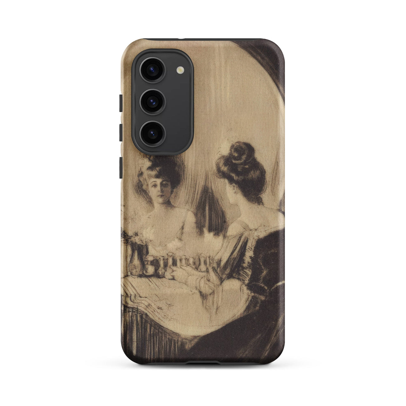 Het stuk circuleerde veel in het begin van de twintigste eeuw, een populaire Amerikaanse prent die illustratie, symbolistische humor en moraliserende traditie erfde van de Europese vanitas. Hier, gedrukt op je nieuwe Samsung-hoesje, herbevestigen de delicate arceringen, tonale gradaties en illusoire architectuur hun kracht: de aantrekkingskracht van schoonheid, de zekerheid van de dood en de dunne scheiding die hen bindt.