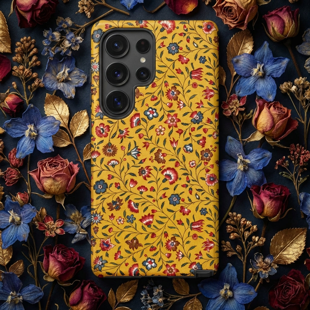 Anjers drukken hun gerafelde gewicht over een goudenroede uitgestrektheid. Deze bloemenpatroon stof Samsung hoesje vertaalt eeuwen van decoratieve kunsten naar een handpalmformaat: het kronkelige wijnstokwerk herinnert aan Arts and Crafts behangontwerpen geworteld in William Morris's Red House experimenten.