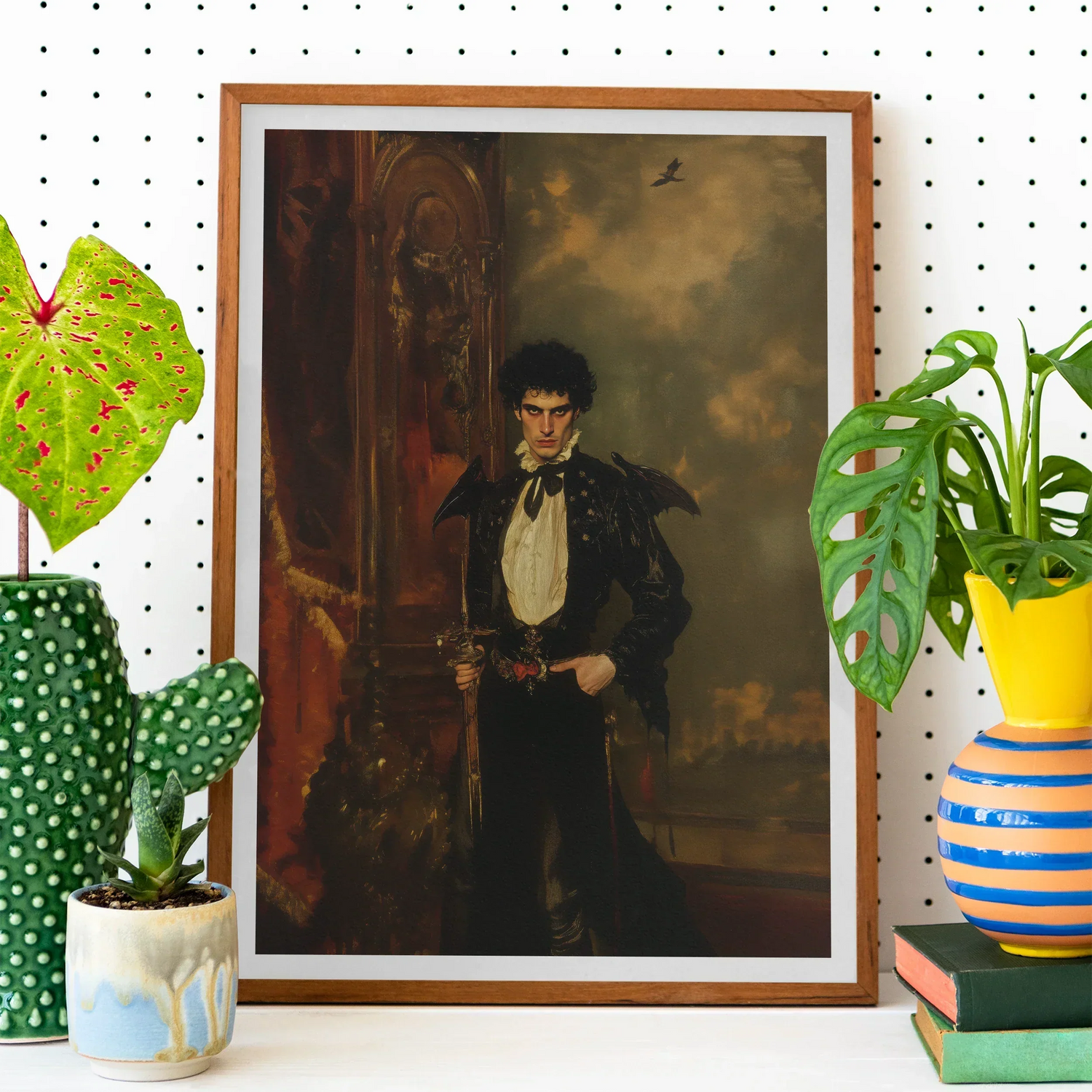 Deze homo -vampier kunstafdruk legt alle details van Armand vast, waarbij elke penseelslag over zijn complexe reis spreekt. Zijn kleren, fijn op maat gemaakt met Victoriaans geïnspireerde precisie, zijn donker als middernacht, doorspekt met de onmiskenbare aanwezigheid van de dood, maar toch gebonden aan de sensualiteit van de eeuwige leven door de roos die zijn taille siert.