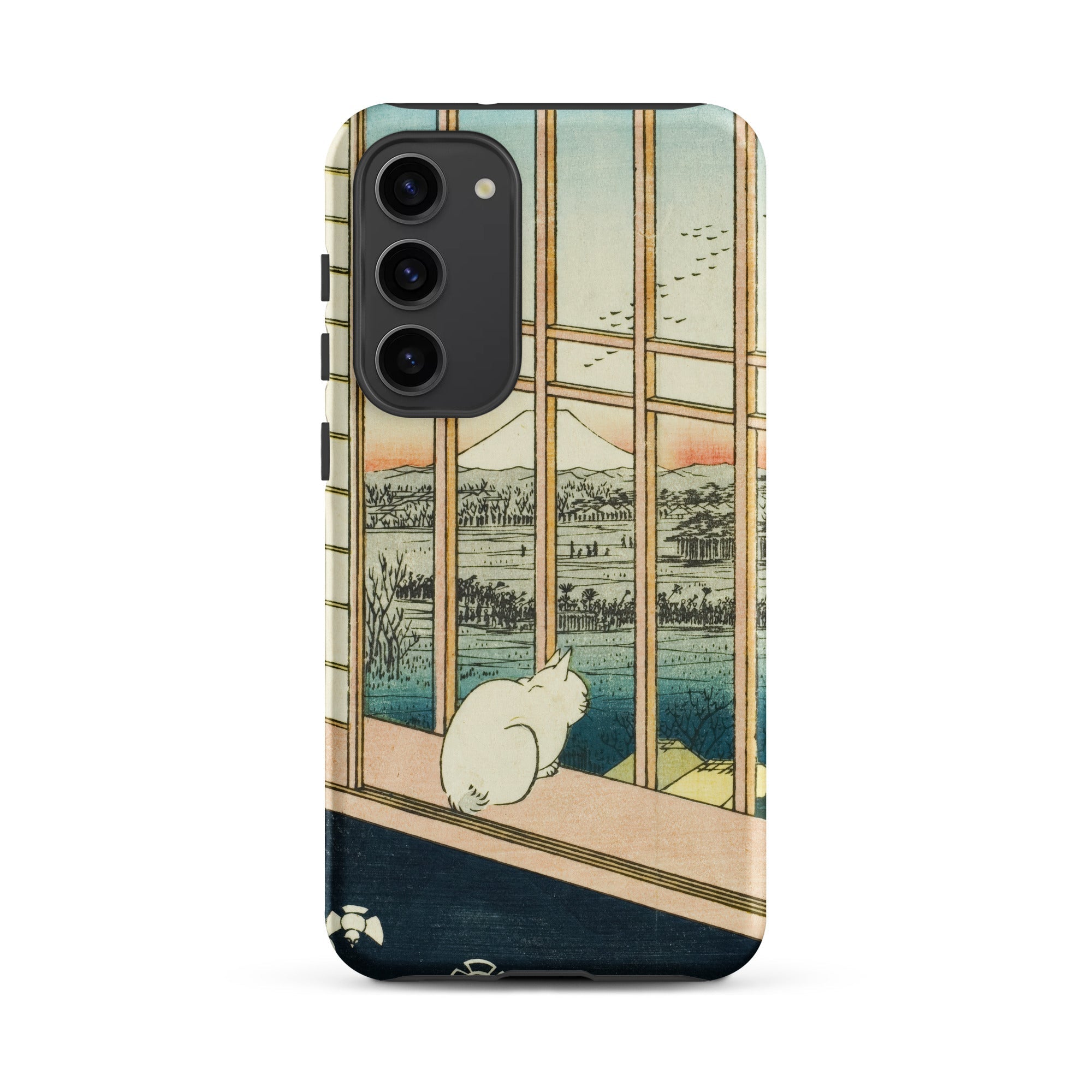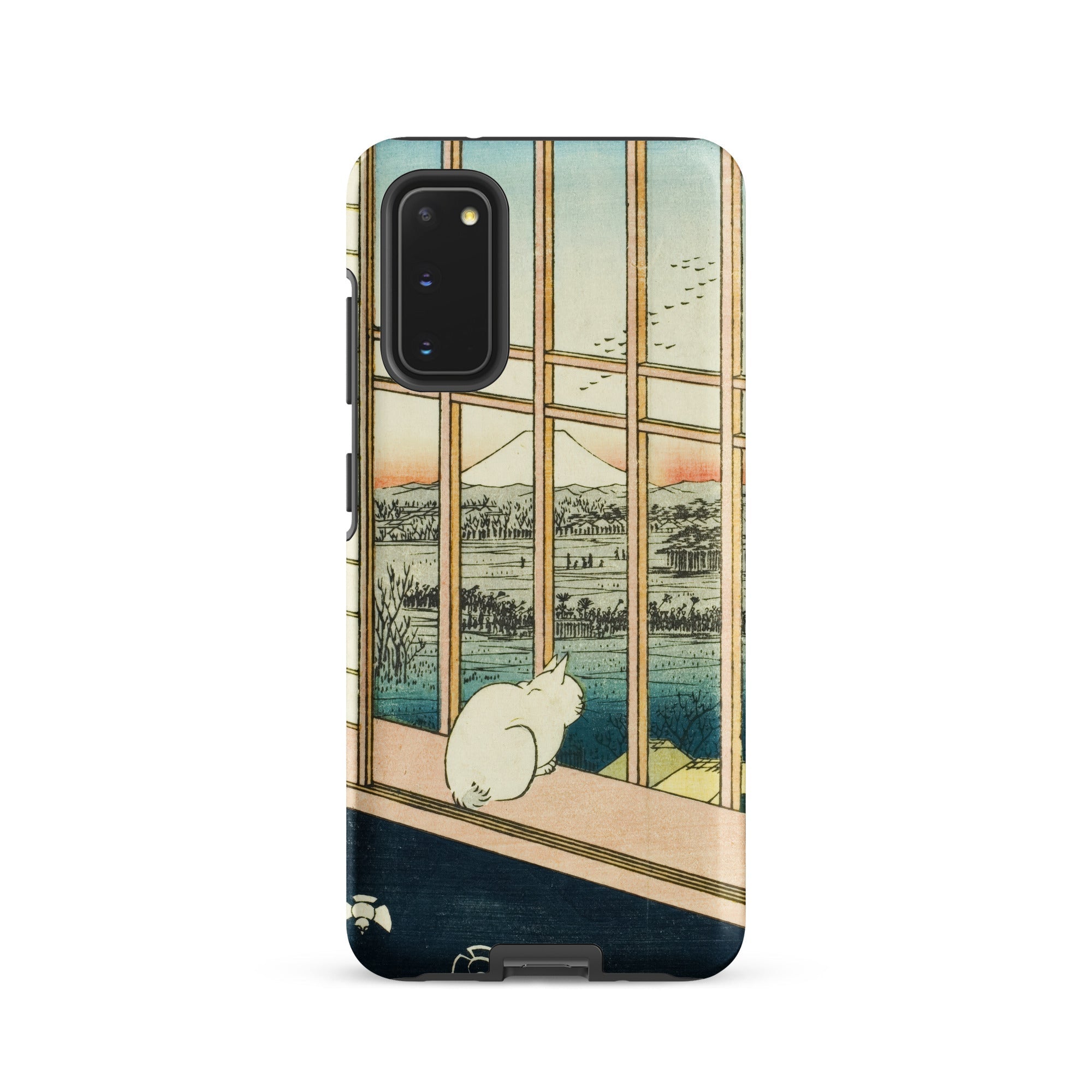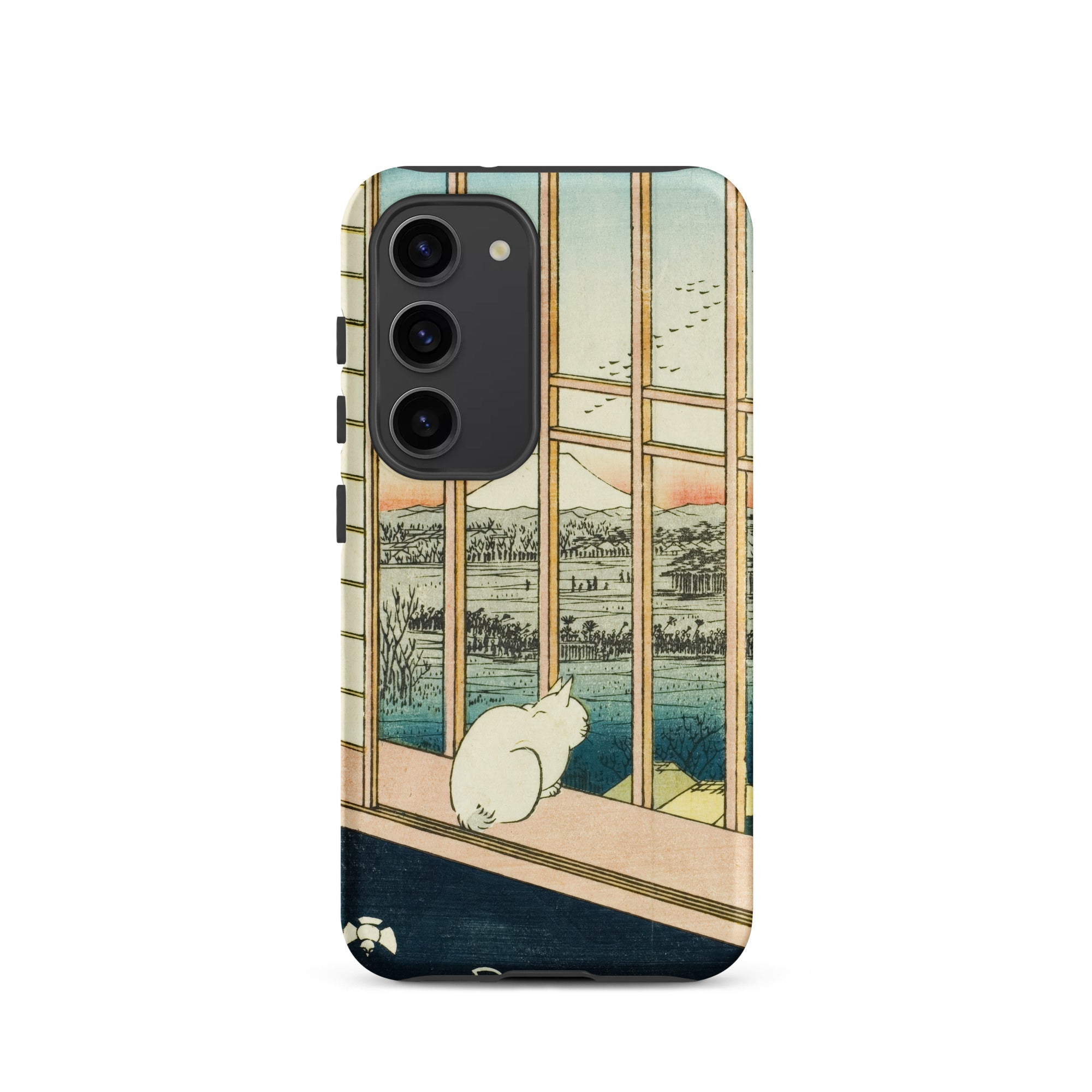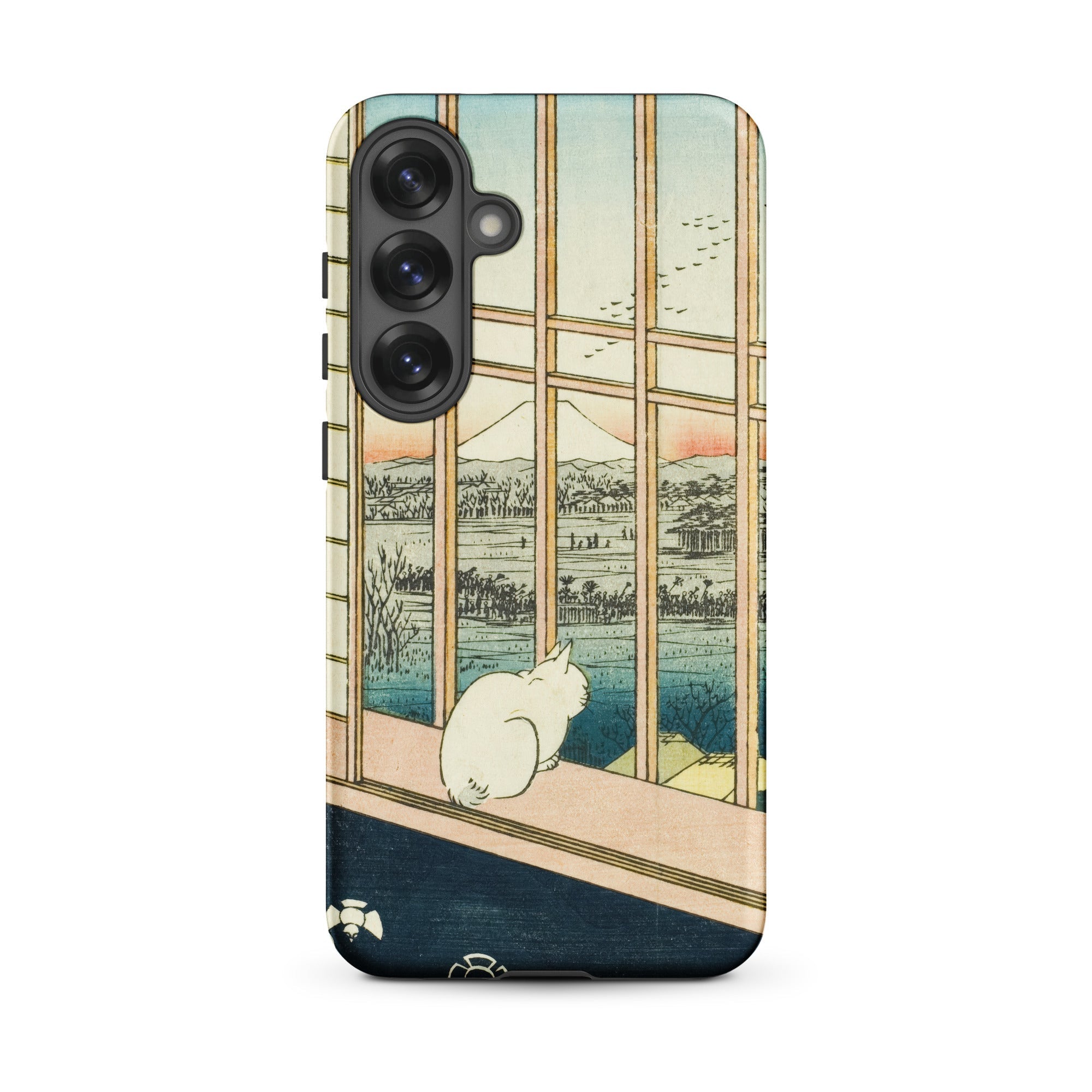 Een eenzame witte kat hurkt bij de veranda, kijkend voorbij het houten traliewerk naar de bleke top van de berg Fuji, waar de zonsondergang de horizon kleurt met roos en indigo. Utagawa Hiroshige's ukiyo-e print Asakusa Rijstvelden en Torinomachi Festival transformeert in een beschermende Samsung-hoes, waarbij Edo-periode kunst wordt vermengd met moderne ambacht.