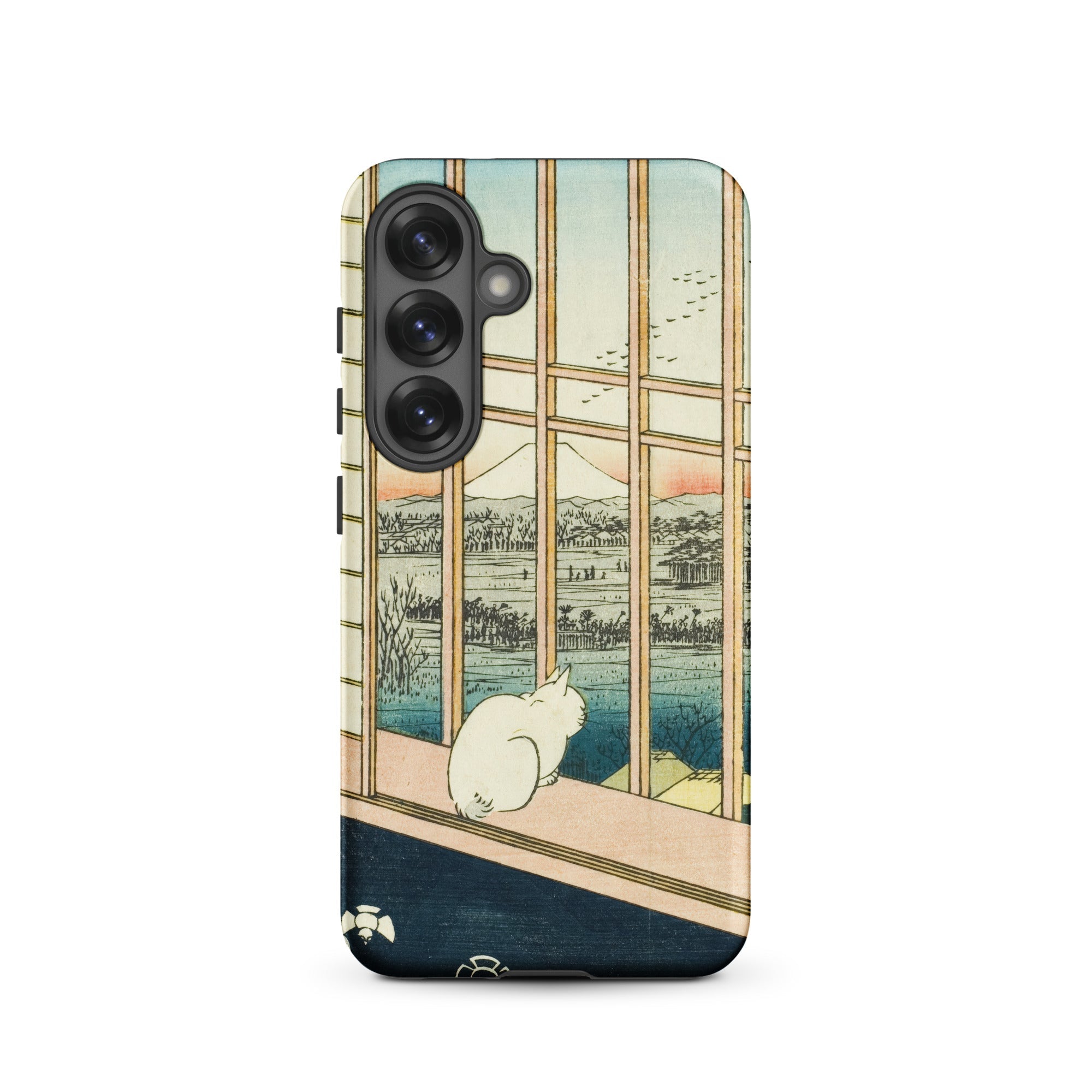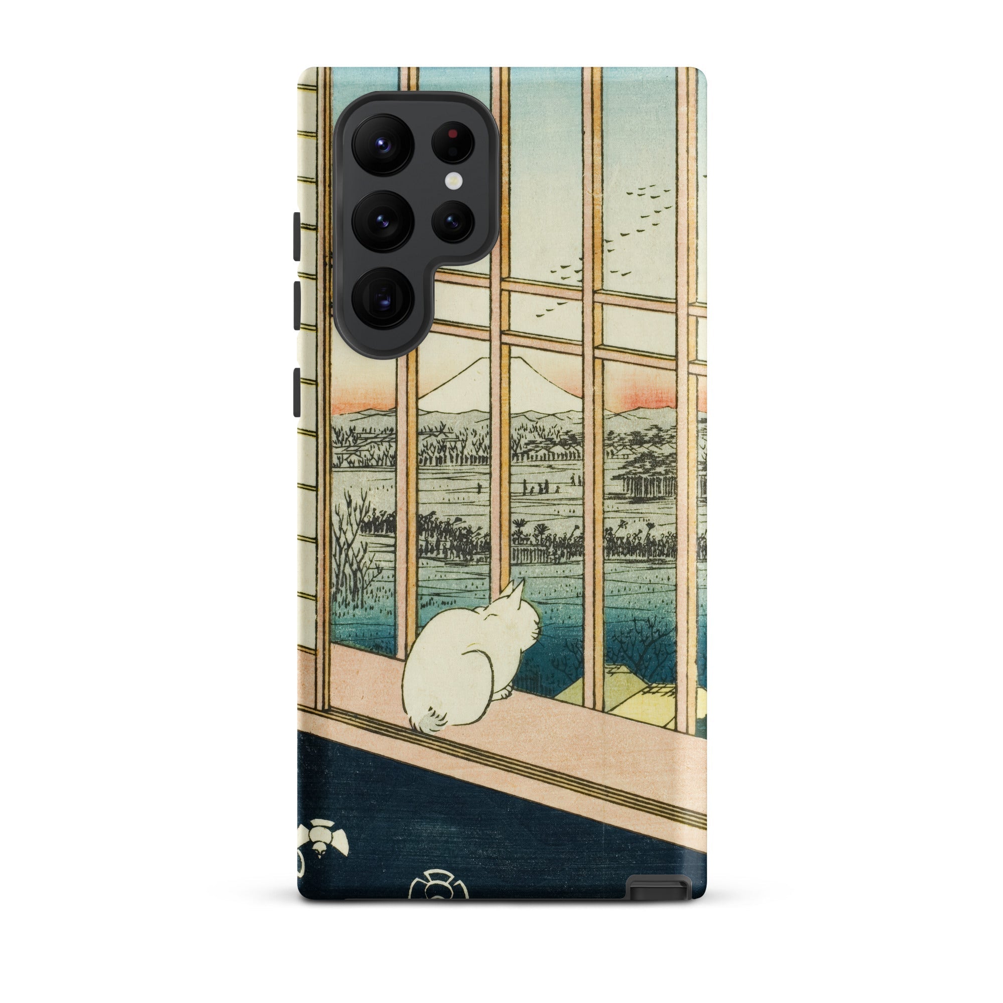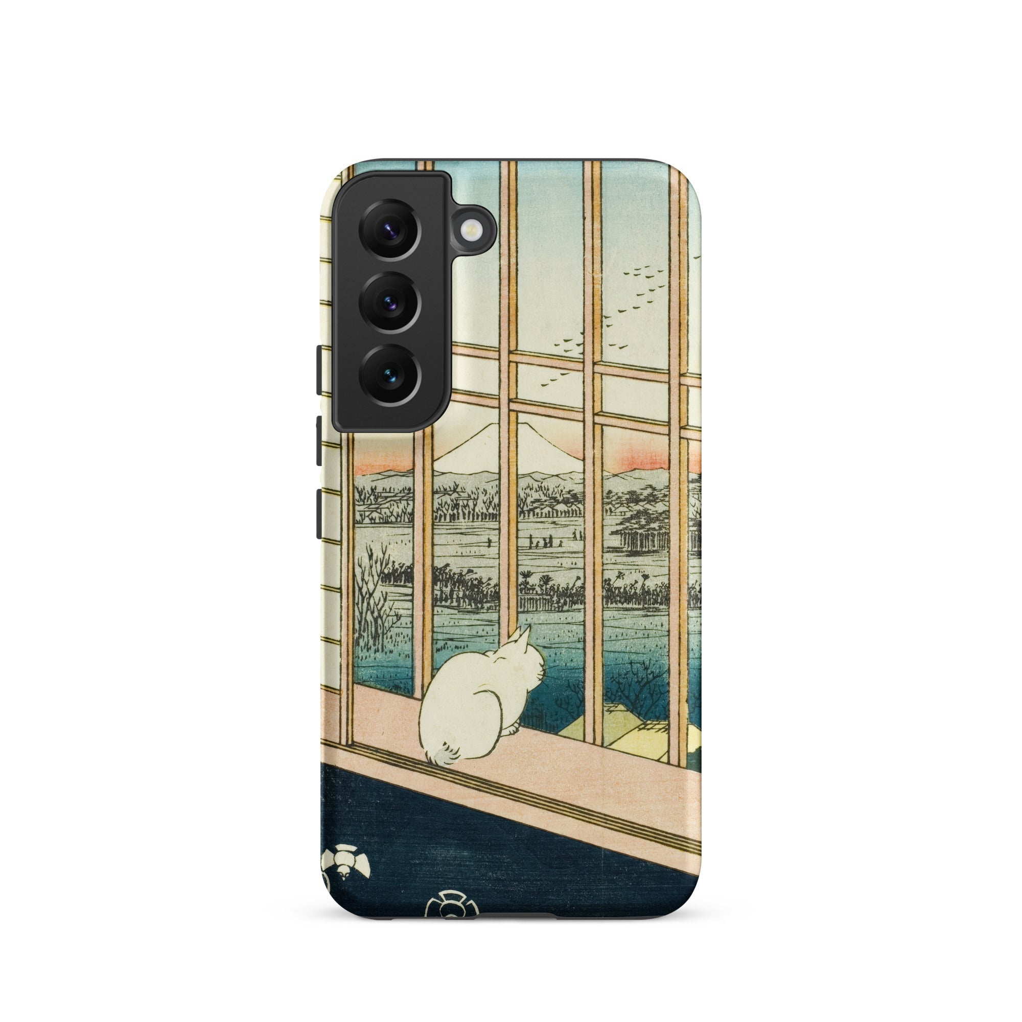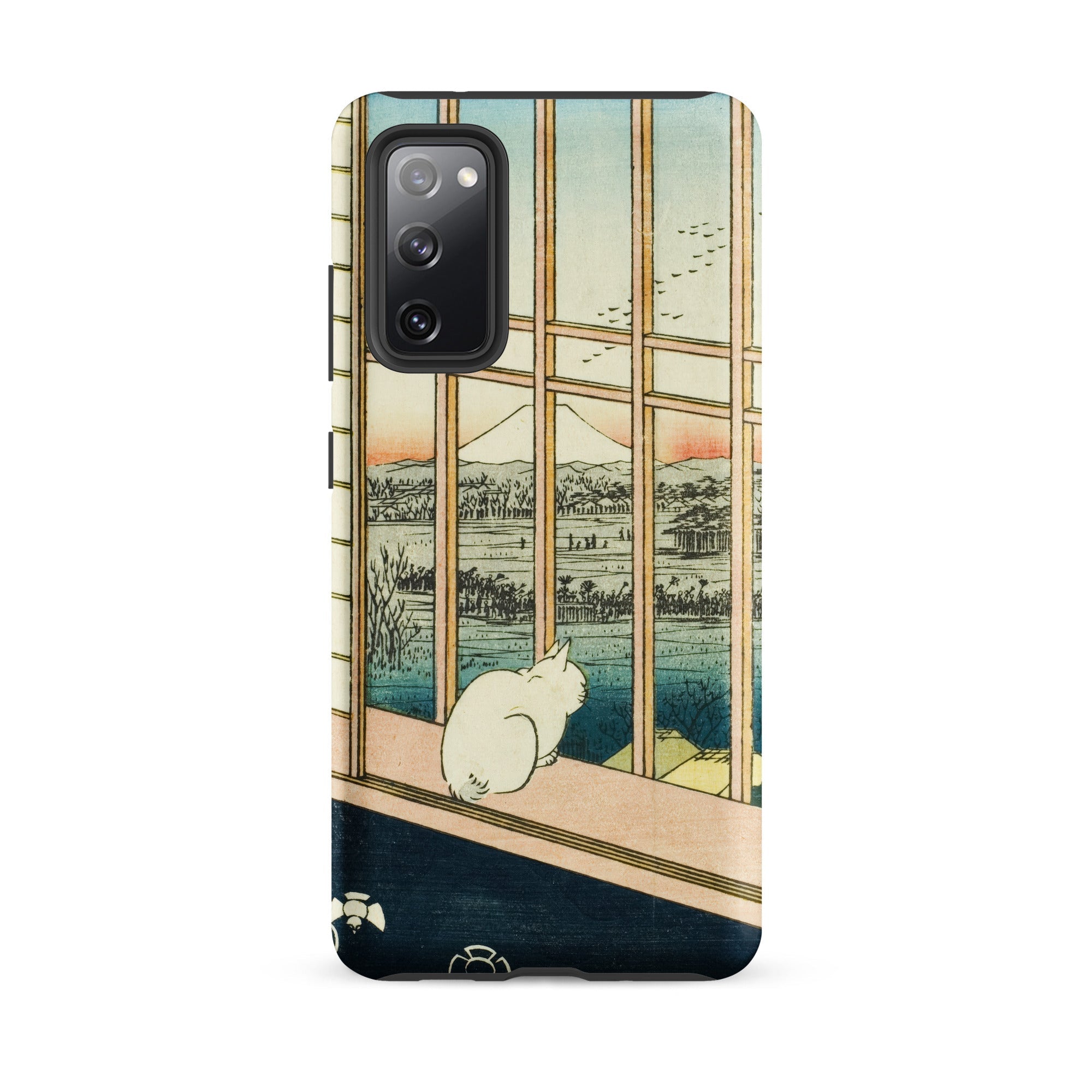 Een eenzame witte kat hurkt bij de veranda, kijkend voorbij het houten traliewerk naar de bleke top van de berg Fuji, waar de zonsondergang de horizon kleurt met roos en indigo. Utagawa Hiroshige's ukiyo-e print Asakusa Rijstvelden en Torinomachi Festival transformeert in een beschermende Samsung-hoes, waarbij Edo-periode kunst wordt vermengd met moderne ambacht.