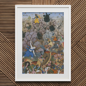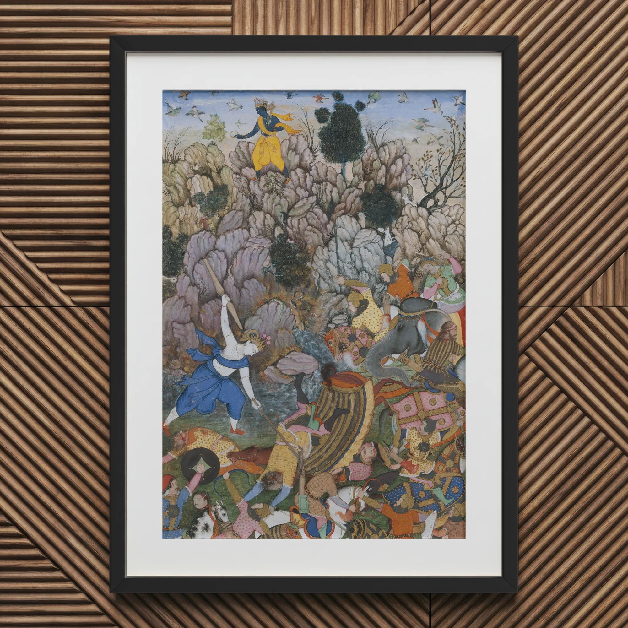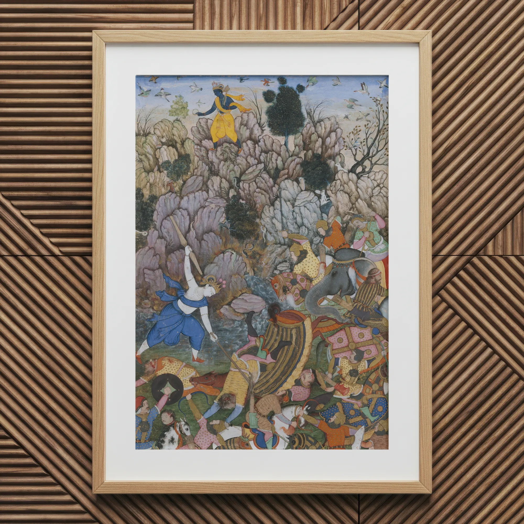 Een hemel dicht bezaaid met vogels welft zich boven het gewoel. Hieronder, grillige stenen richels gewassen in mauve, een werveling van ledematen, slagtanden, hoeven en rechtvaardige woede barst los in theatrale cadans. Balarama zwaait met zijn stamper—een witte boog van oordeel—terwijl Krishna, gehuld in hemels geel, erboven zweeft als een belofte die vlees is geworden. Tussen hen in tuimelen vijanden: verwrongen in zijde, verpletterd onder paarden en oorlogsolifanten in patroonbarding, hun nederlaag steek voor steek geschilderd in vermiljoen en oker.