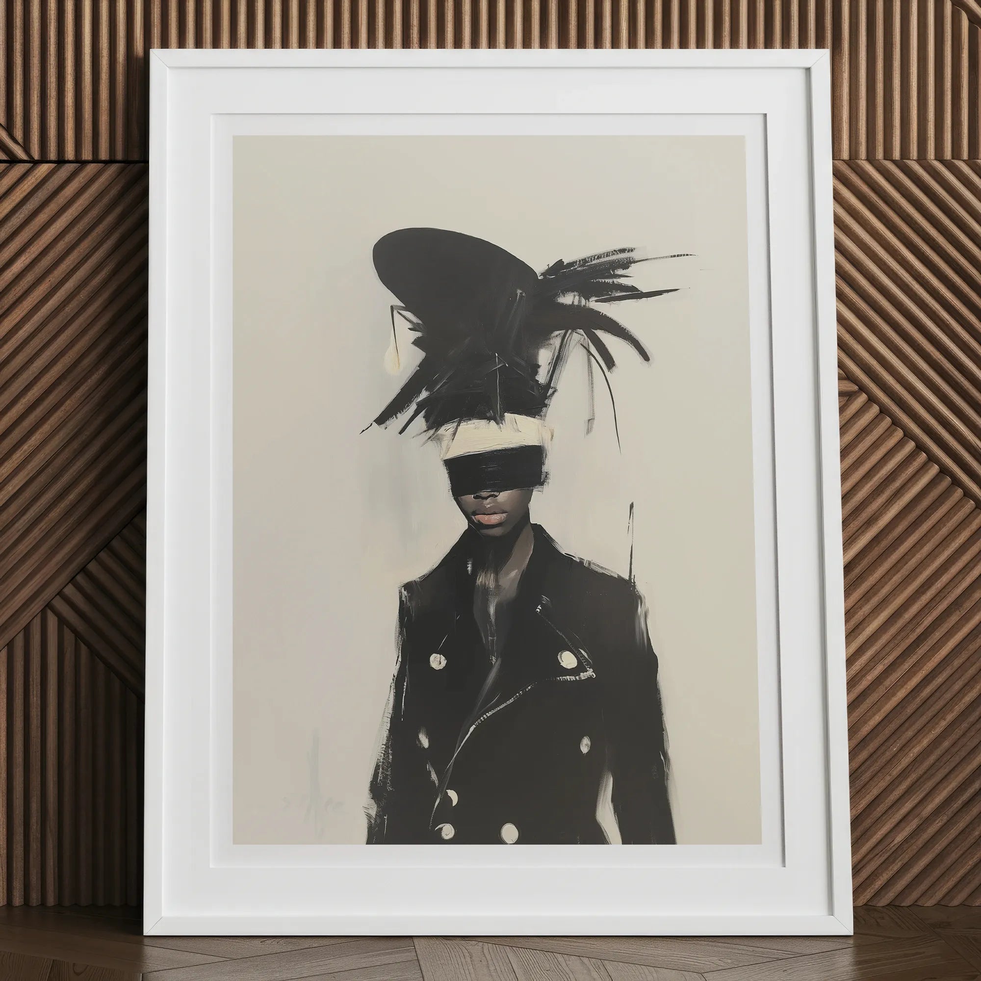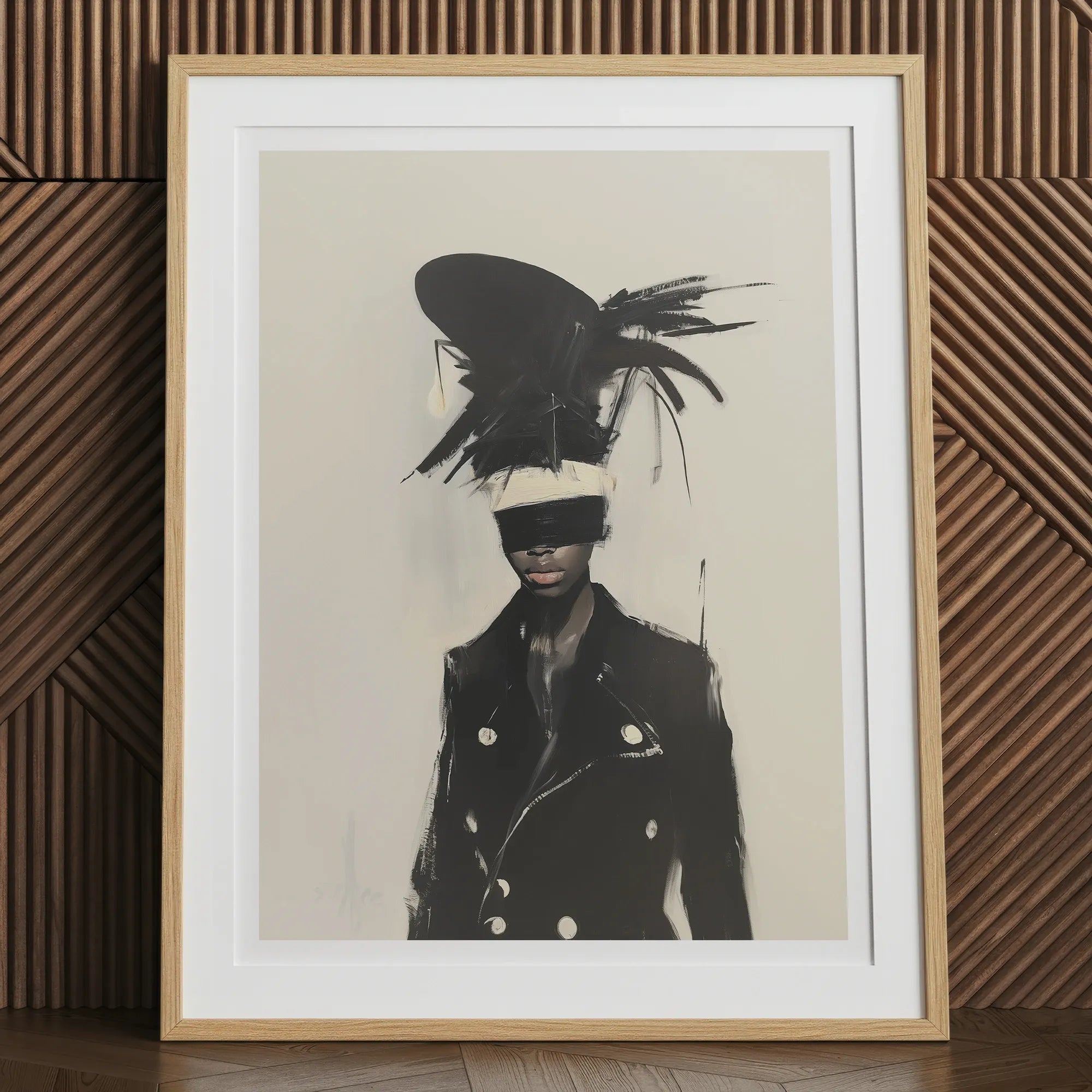 Weergegeven in expressionistische vegen die dichter bij toverspreuken lijken te liggen dan bij penseelstreken, daagt deze kunstdruk elegantie uit met ongehoorzaamheid. Elk element voert het geweld en de poëzie van zichtbaarheid uit—een vlijmscherp leren jack, de onmogelijke pluimen van een surrealistische bicorne hoed, huid als onyx verlicht door maanmelk. De scherpe crèmekleurige blinddoek snijdt over hun ogen als een litteken dat heilig is gemaakt. Je kijkt niet naar hen. Je bent getuige van hen.