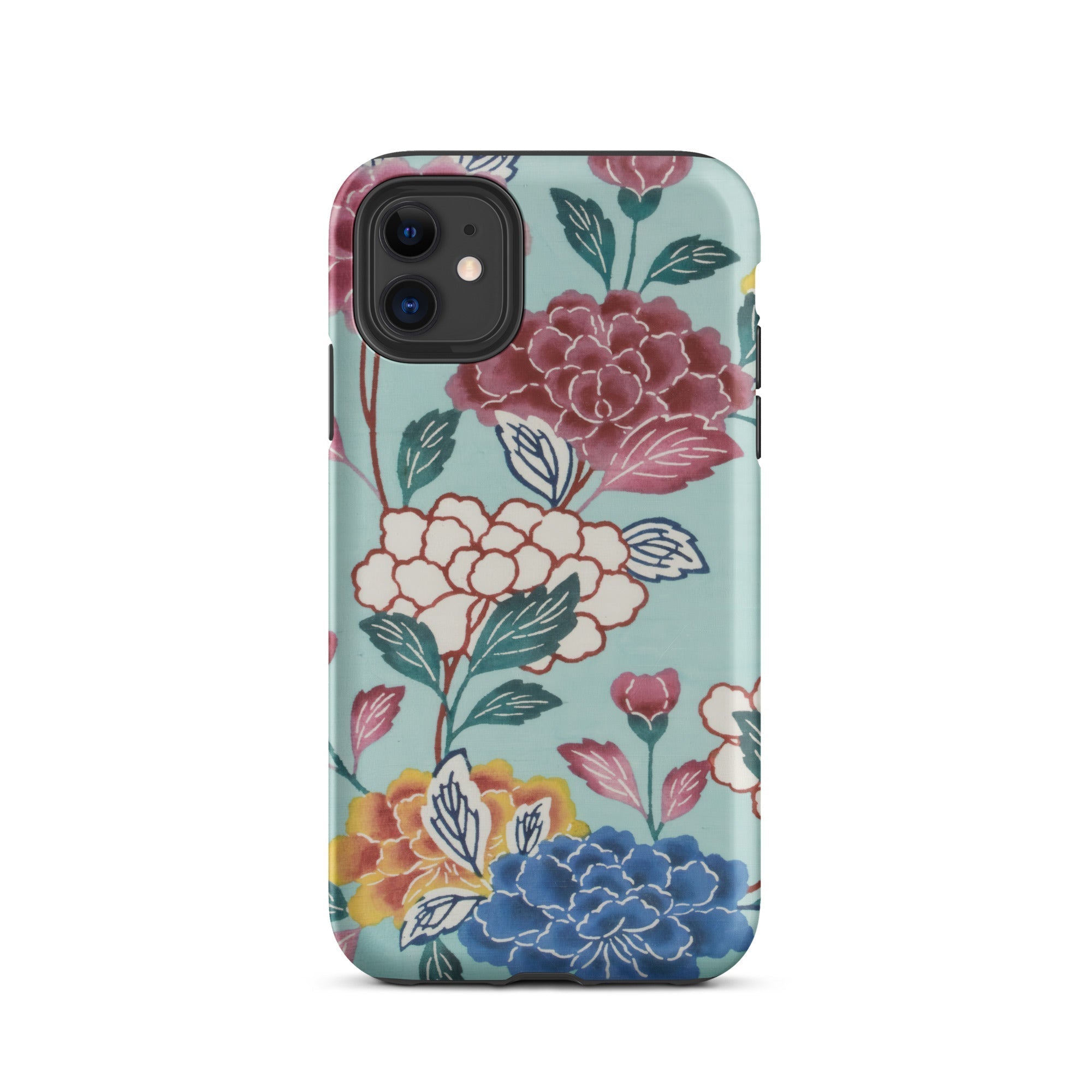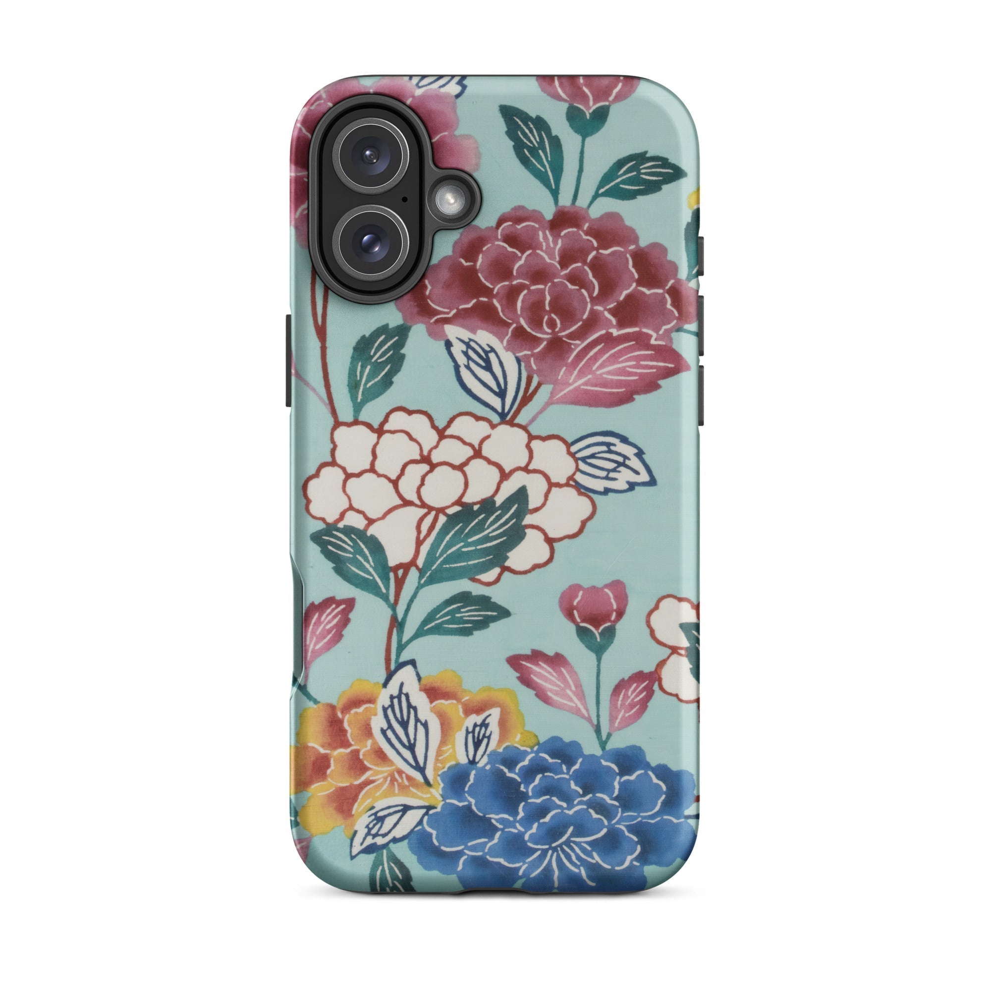 Deze bingata-paneel iPhone-hoes draagt de Okinawaanse ververingstradities over zijn oppervlak, waar karmijnrode bloemblaadjes oprijzen naast albasten bloesems, elk omlijnd met indigo contouren. Een achtergrond van celadongroen stabiliseert de compositie, waardoor saffraan- en kobaltblossoms op de onderste rand ontbranden.